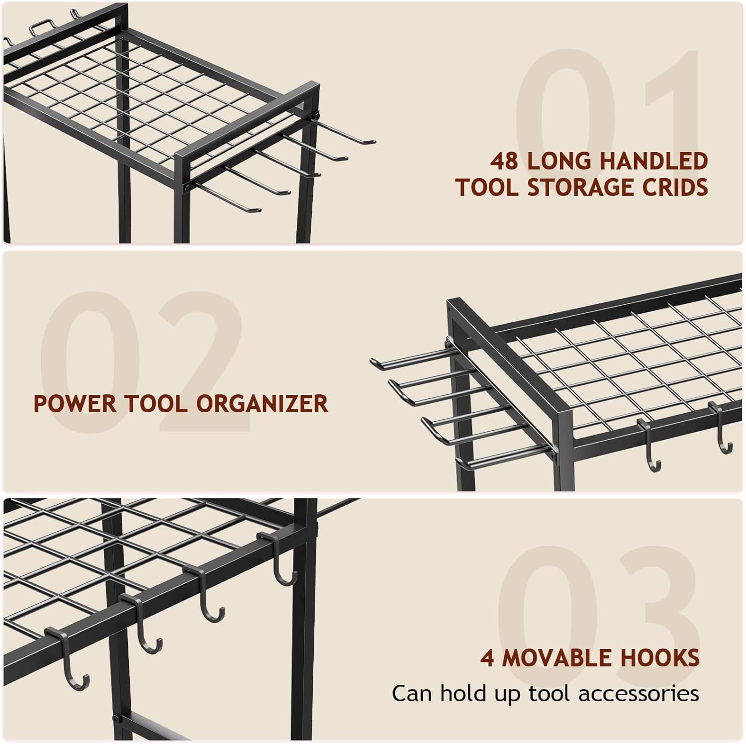 - 【Efficient Garden Tool Rack】: Elevate your gardening experience with the Homsorout efficient garden tool organizer. Featuring 48 tool slots, it offers ample storage. The 4 movable garage hooks provide additional hanging options for easy access to frequently used tools. Equipped with adjustable feet, it adapts to any uneven surface. Simplify tool organization and arrangement with this practical garden tool storage holder, making your gardening tasks easier than ever before.