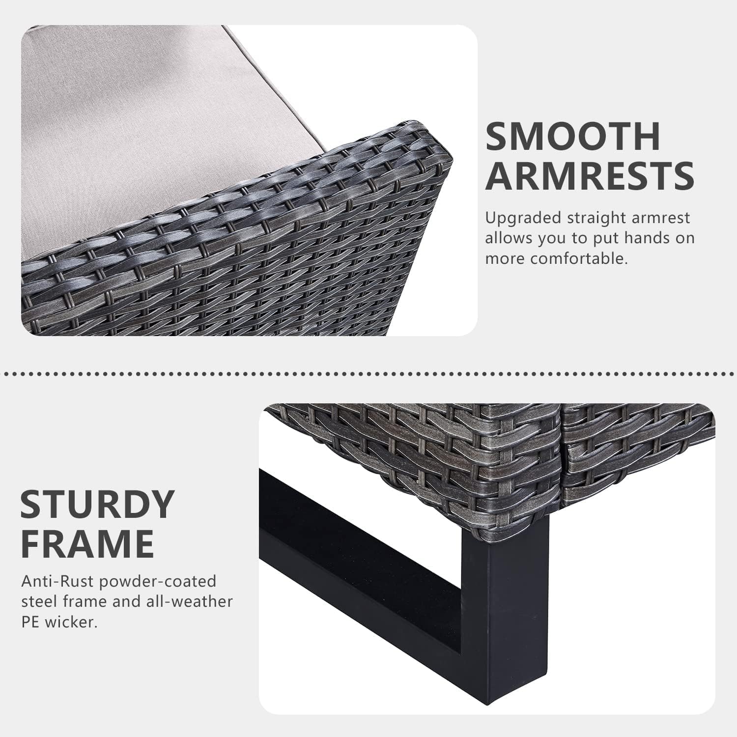 - 【Upgrated Elegant Design】All made with Anti-Rust powder-coated steel frame and All-weather Hand-Woven PE wicker to make this patio furniture set is resistant to UV and weather,The patio conversation sets is totally upgraded with straight armrest and the heightened ergonomically curved backrest.