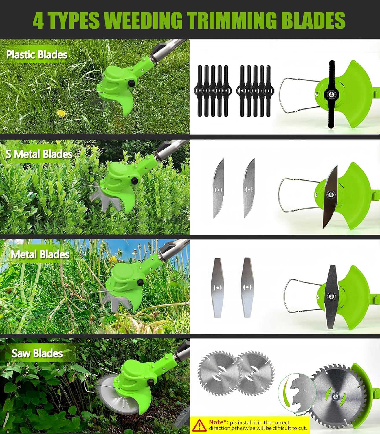- 【Versatile Blades for Any Task】Cordless weed wacker with four types of blades: Manganese steel circular saw blades for shrubs and branches, stainless steel blades for thick weeds and hedges, S-shaped metal blades for small brush, and trimmer string for tall grass. Easily swap Weed wacker blades to achieve professional results in every corner of your yard.