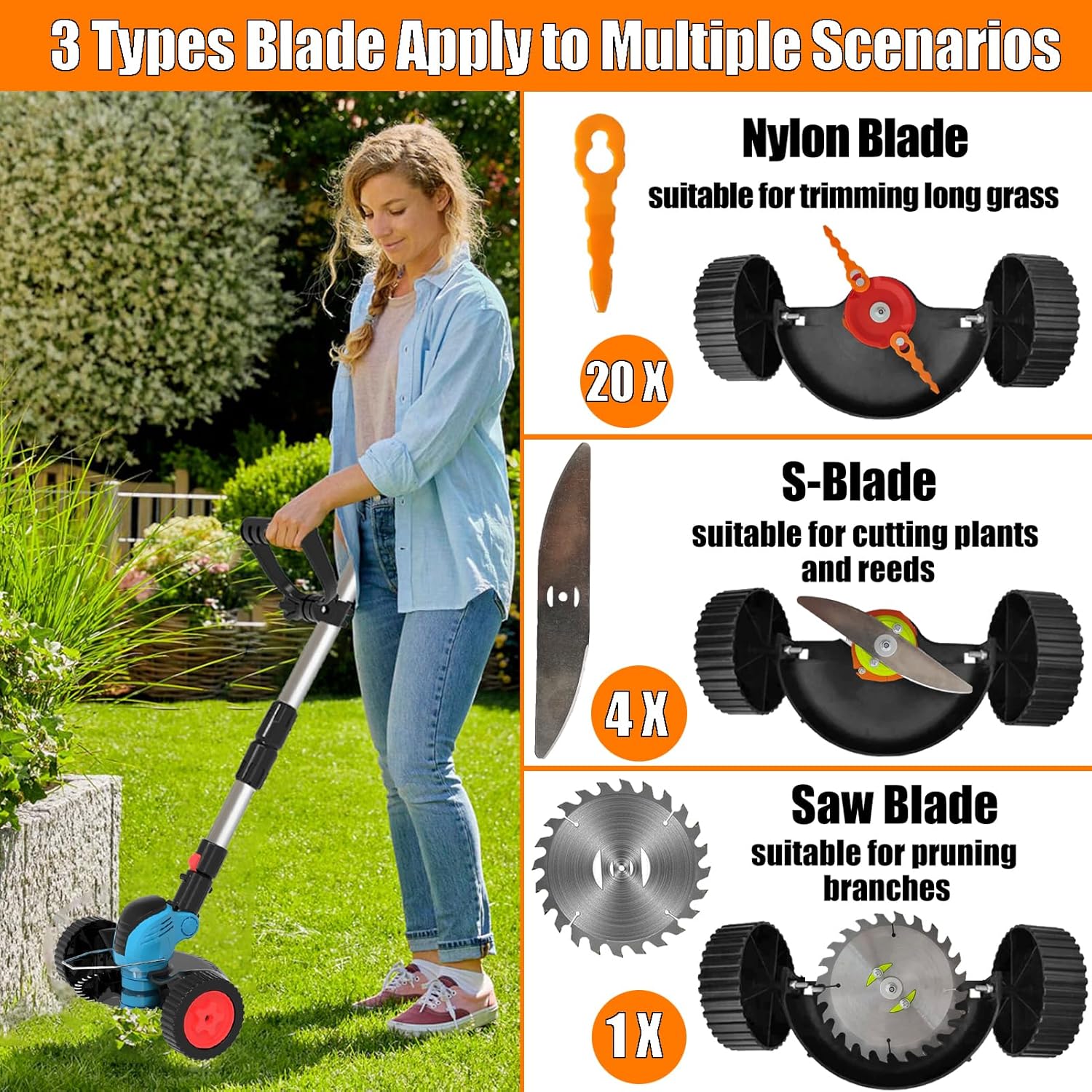 - ELECTRIC EATER WITH 3 TYPES 25PCS BLADES: The battery weed wacker has 3 types of cutting blades to meet different weeding needs. Nylon blade suitable for mowing soft grass; s-blade suitable for cutting thick weeds and small shrubs; saw blade suitable for pruning reeds and branches. The weed wacker battery operated is ideal for trimming around yards & bushes, lots, flower beds, and walkways