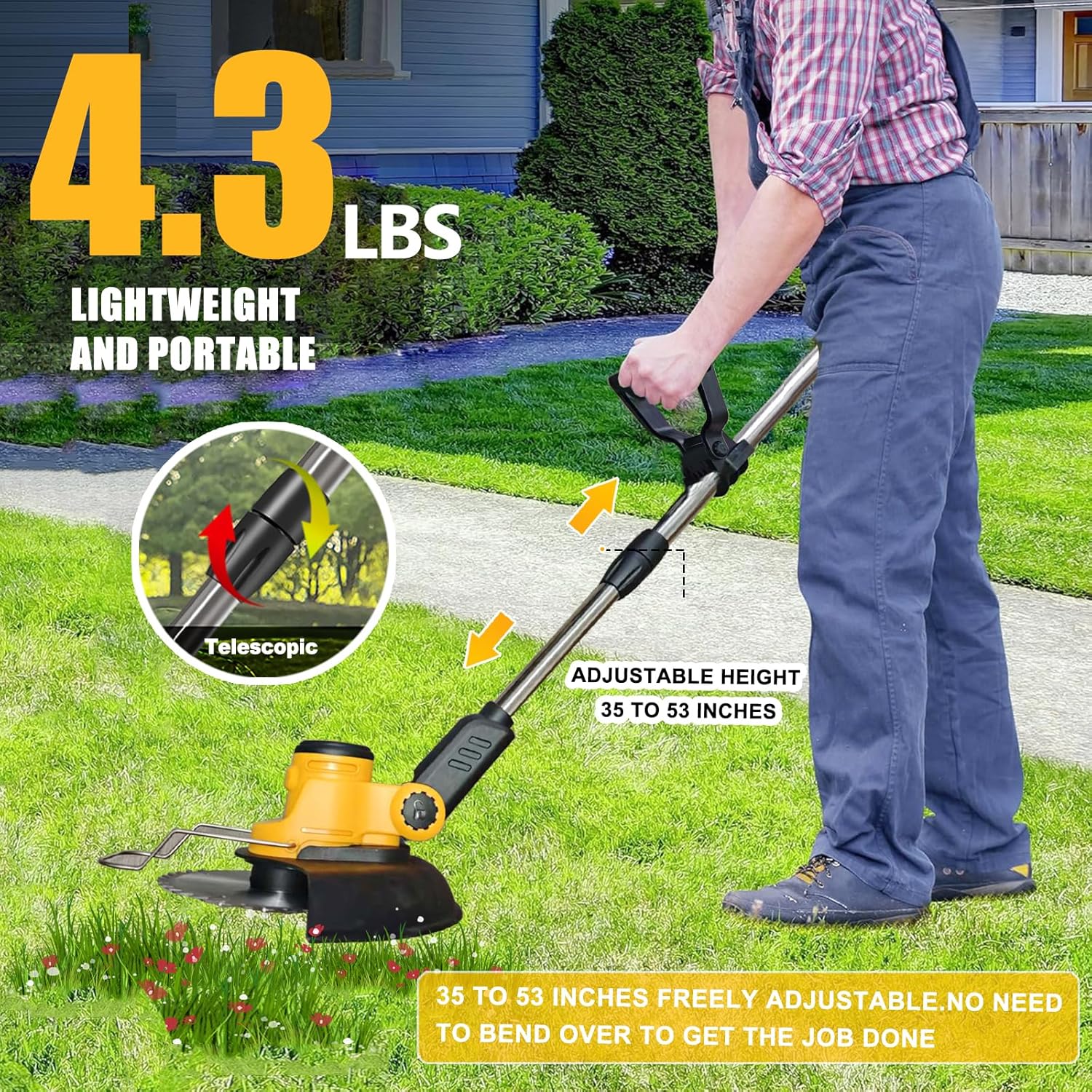 - 🎁【Adjustable design】Cordless weed wacker electric has an adjustable lever that can be freely adjusted between 37 and 53 inches, Provide the required length for everyone, Working in a comfortable position to reduce pressure on the waist and shoulders. Angle of the cordless weed eater head can be adjusted betw7en 0-90 degrees, making it easy for you to handle every corner and gap, improving work efficiency.