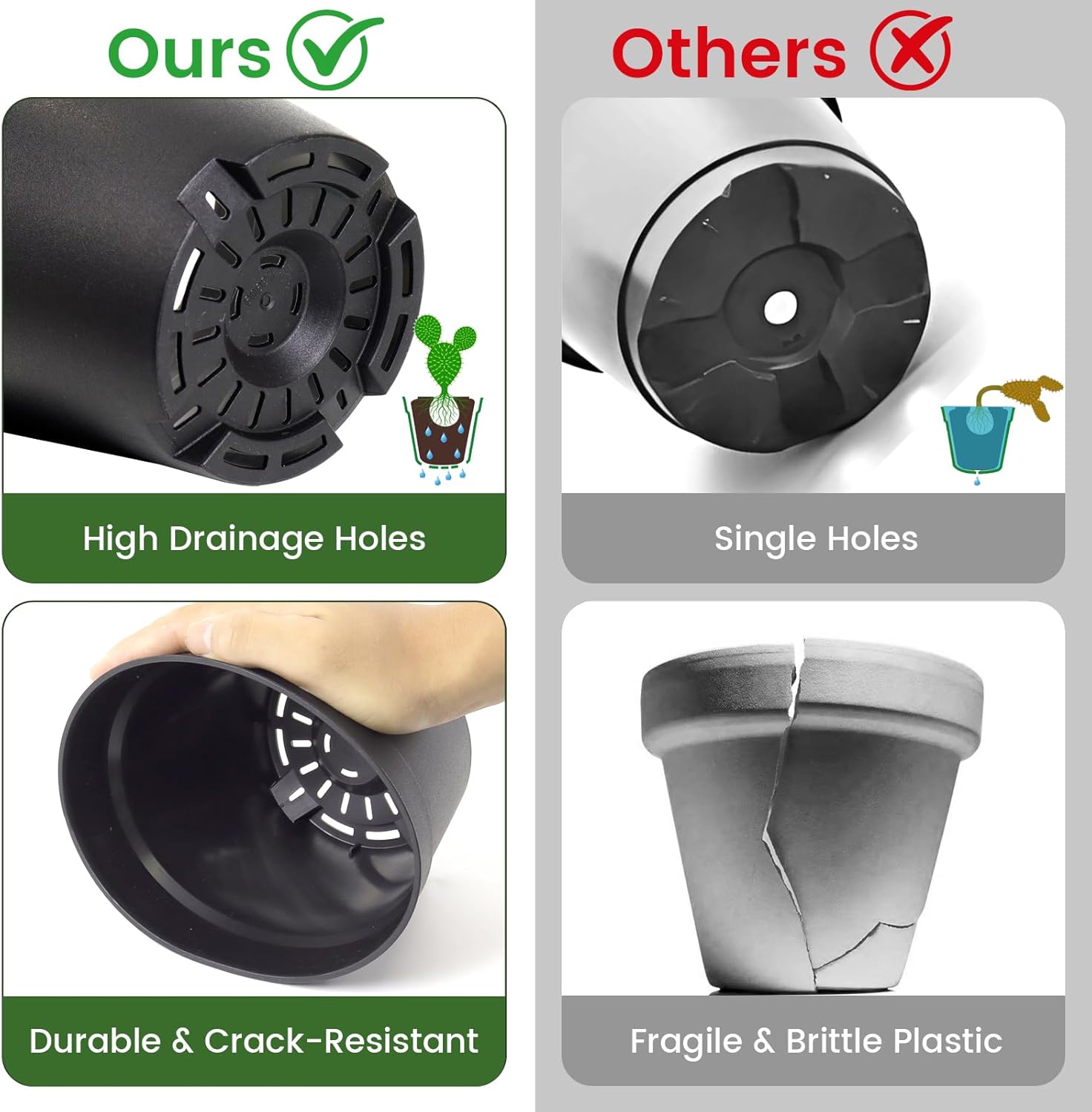 - [Drainage System Designed for Healthy Roots] These 6 inch plant pots feature multiple drainage holes at the bottom to promote airflow and prevent waterlogging. Matching saucers help catch excess water and reduce mess, making them ideal plant pots with drainage for both indoor and outdoor use.