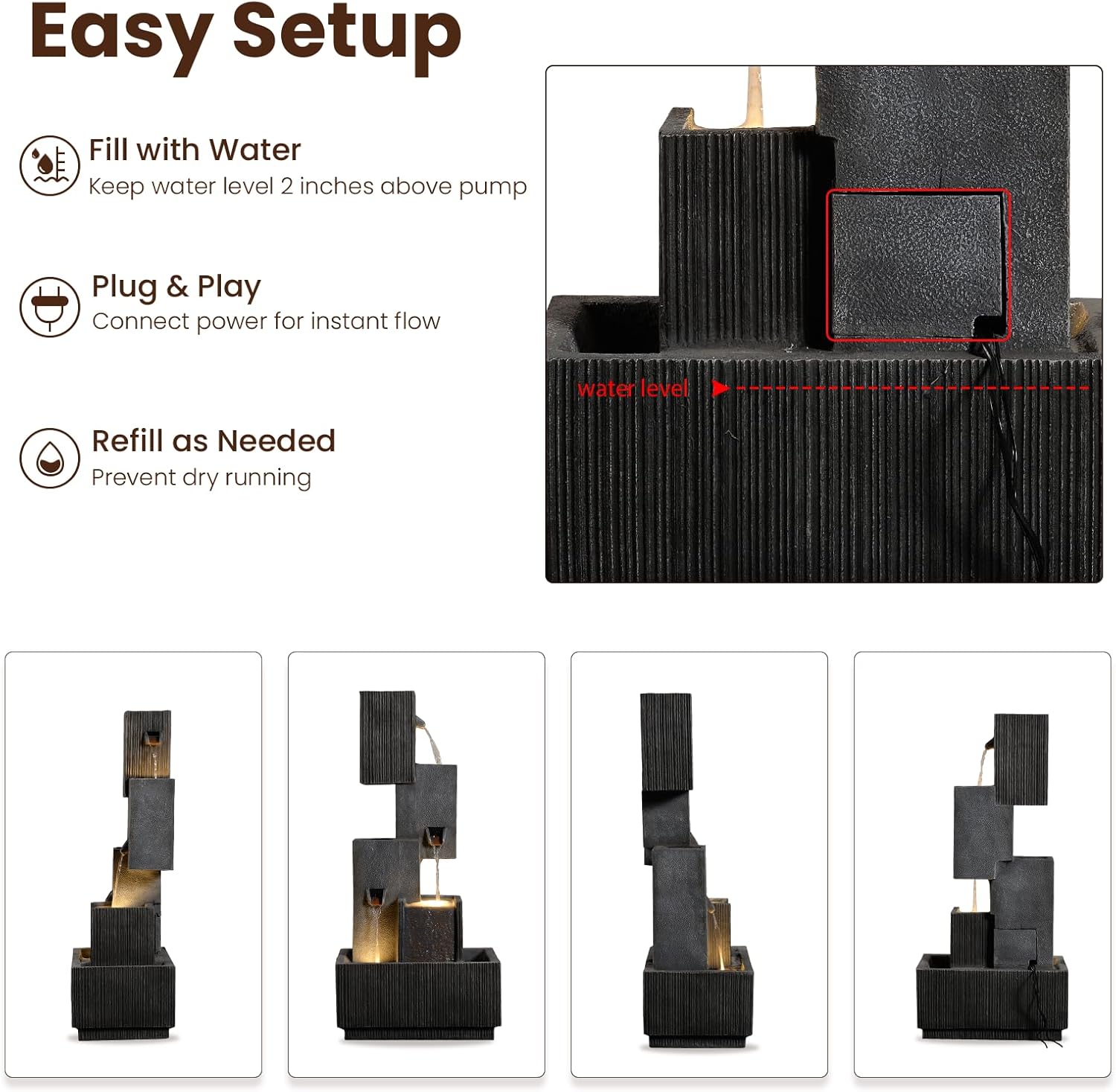 - EXQUISITE OUTDOOR FOUNTAINS - Crafted with interlocking cubes of varying styles,this patio fountain creates a stunning cascade effect. The cubes elegantly stack and coordinate,each bearing water flow with harmonious synergy,forming a mesmerizing waterfall fountain that captivates the eye.Our freestanding gray fountain hue adds a touch of sophistication,making it an ideal choice for those seeking a sleek and stylish outdoor garden fountain.