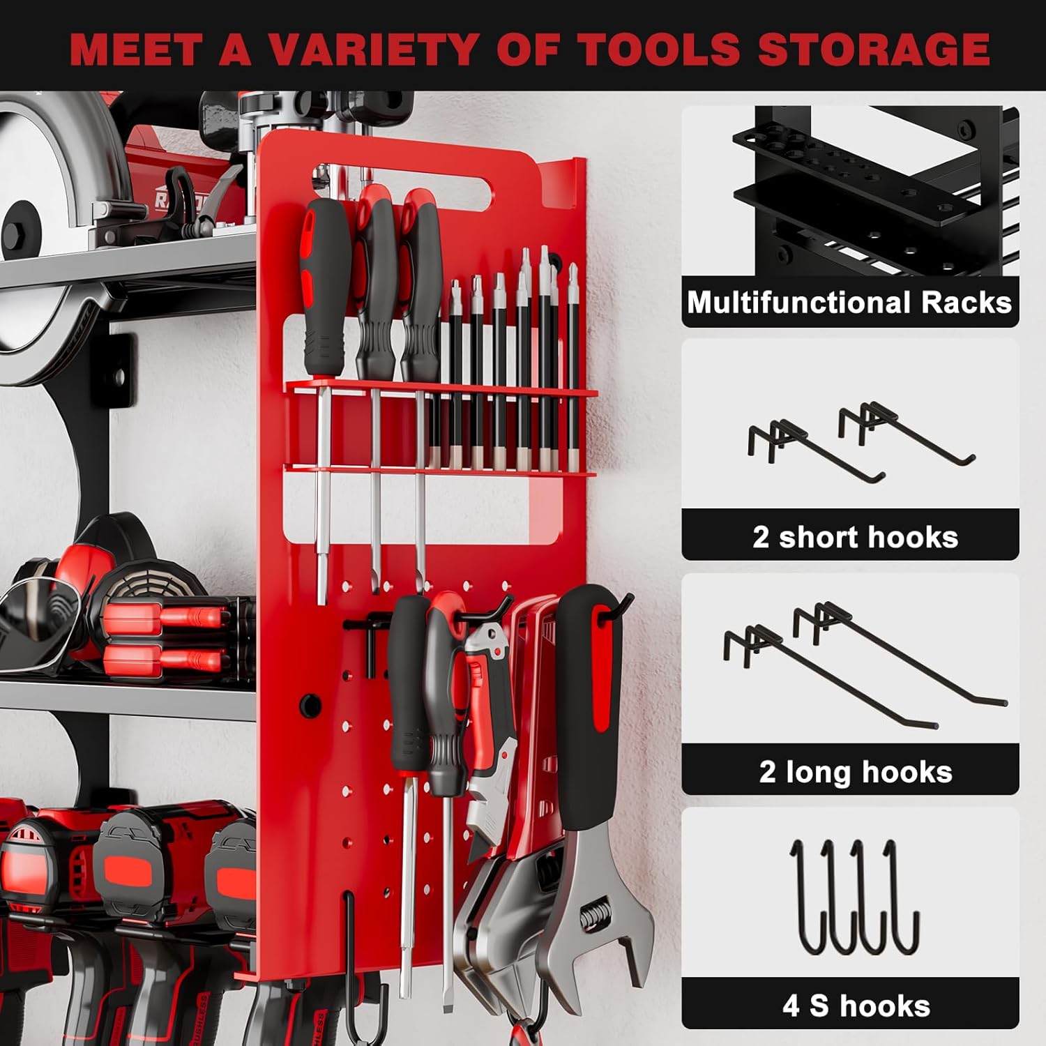 64" Power Tool Organizer Wall Mount, 16 Slots, 3-Tier Drill & Cordless Tool Storage Holder with Pegboard Sides, Tool Wall Organizer for Garage & Workshop Red