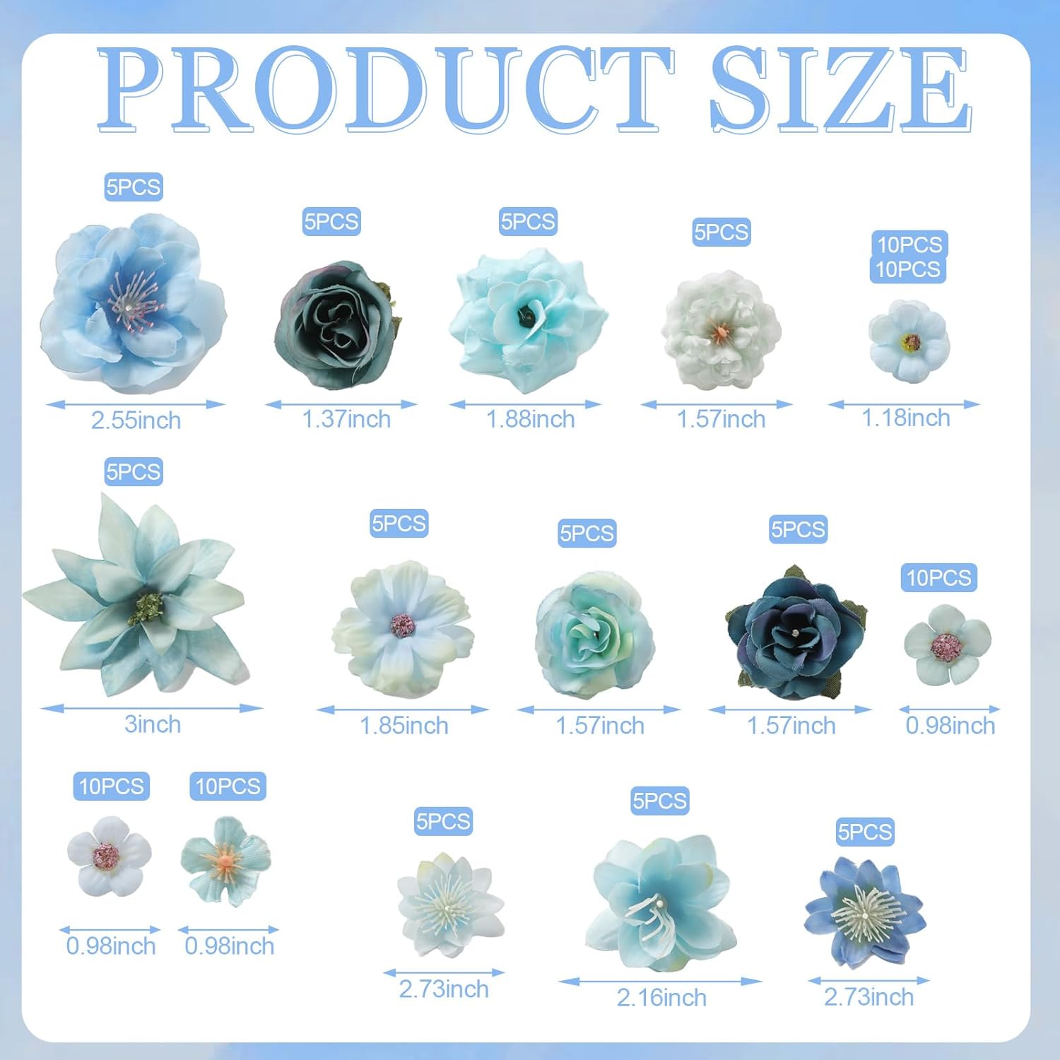 - Package Details:0.9inch mini daisy flowers x30pcs;1.1inch White wild rose x10pcs;1.85inch Star-Talk Flower x5pcs;2.16inch orchid x5pcs;1.96inch camellia flower x10pcs;1.37inch mini rose x5pcs;1.88inch Scottish Rose x5pcs;2.55inch gardenia rose x5pcs;1.37inch peonies x5pcs,1.57inch White wild rose x5pcs;3inch orchid x5pcs;2.73inch orchid x10pcs;