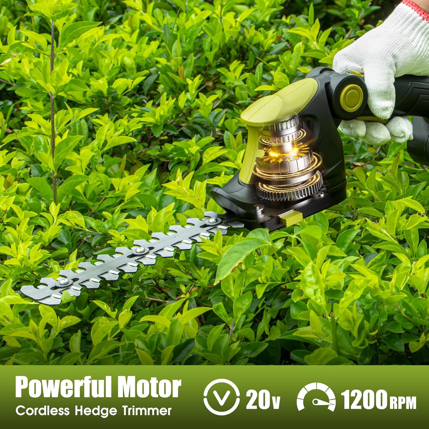 - [DOUBLE SAFETY LOCK FEATURES] Your safety is of utmost importance to us! Our handheld electric hedge trimmer is equipped with essential safety features. Blade guards and a safety switch are in place to prevent accidental injuries. The upper trigger safety lock - out ensures that the tool won't start unexpectedly. To operate, simply push the trigger lock and press the trigger at the same time. Blade switching is a cinch β just press the buttons on both sides; no additional tools are required.