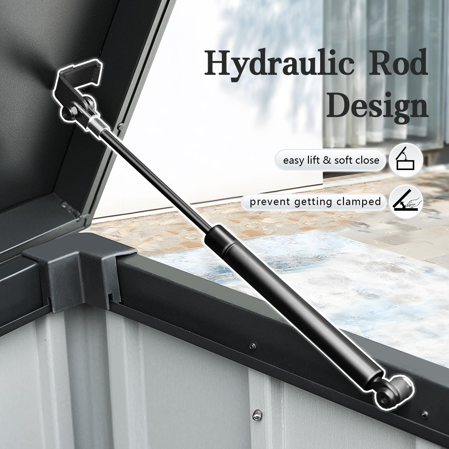 - Smooth Hydraulic Lid – Two hydraulic air rods ensure effortless opening and gentle, controlled closing, reducing the risk of pinched fingers for safe and hassle-free use.