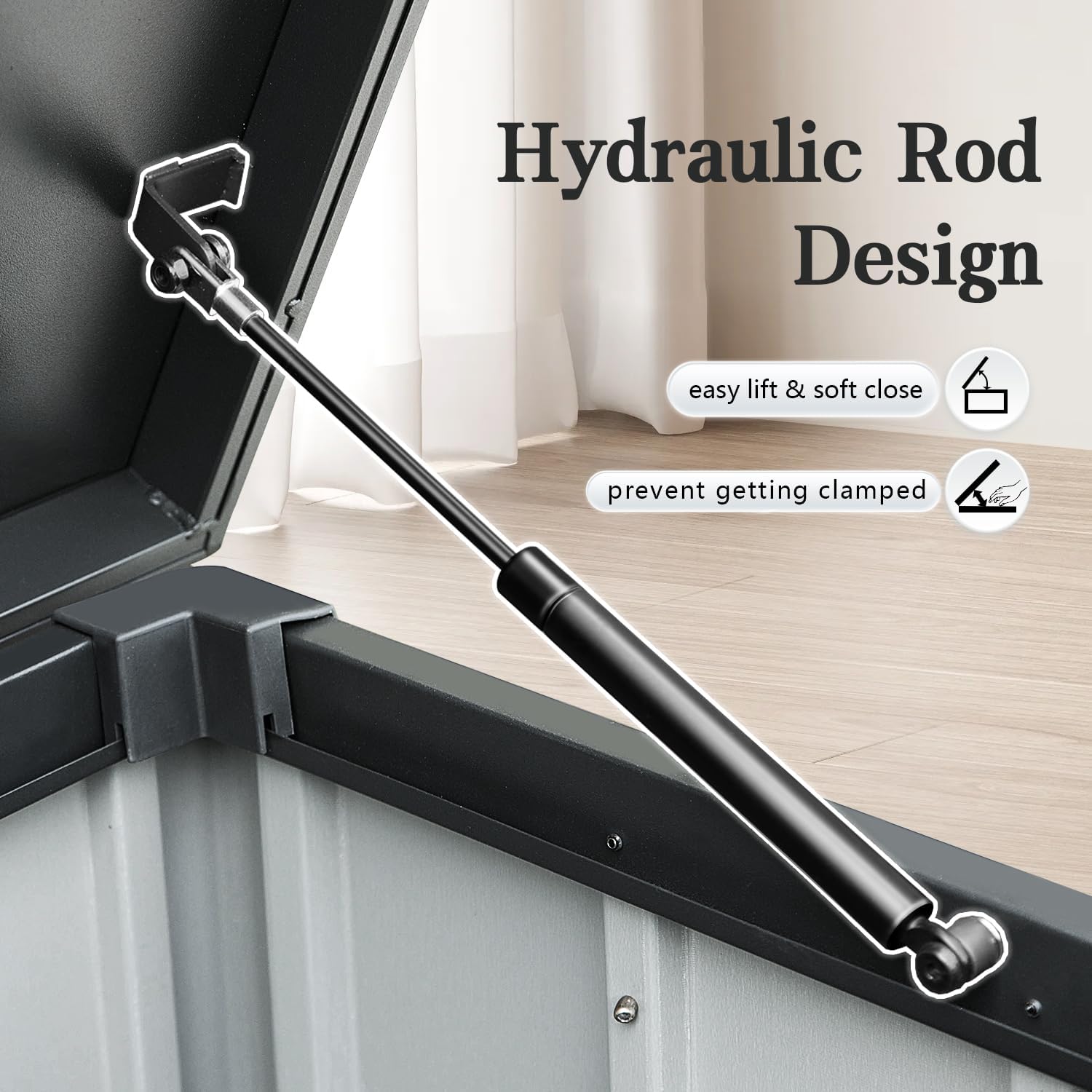- Smooth Hydraulic Lid – Two hydraulic air rods ensure effortless opening and gentle, controlled closing, reducing the risk of pinched fingers for safe and hassle-free use.
