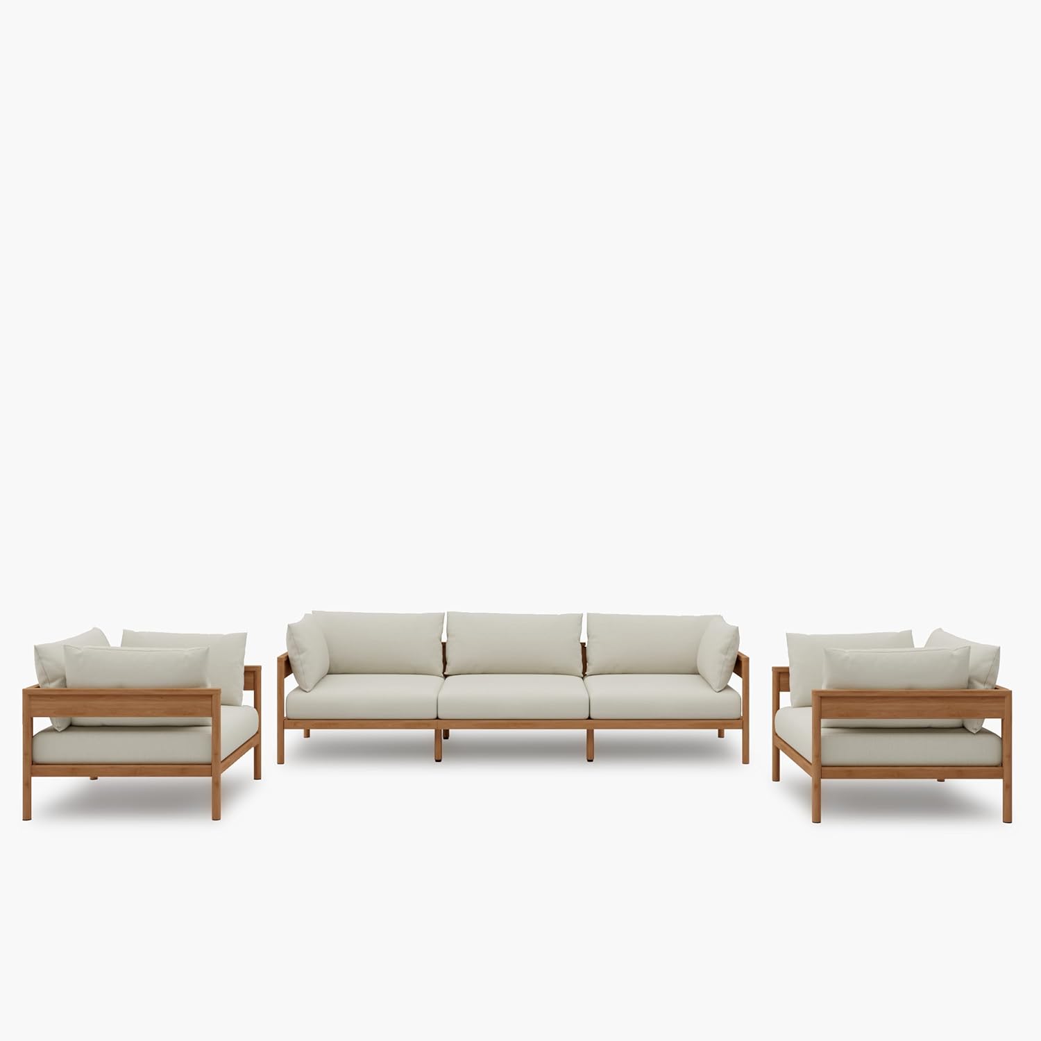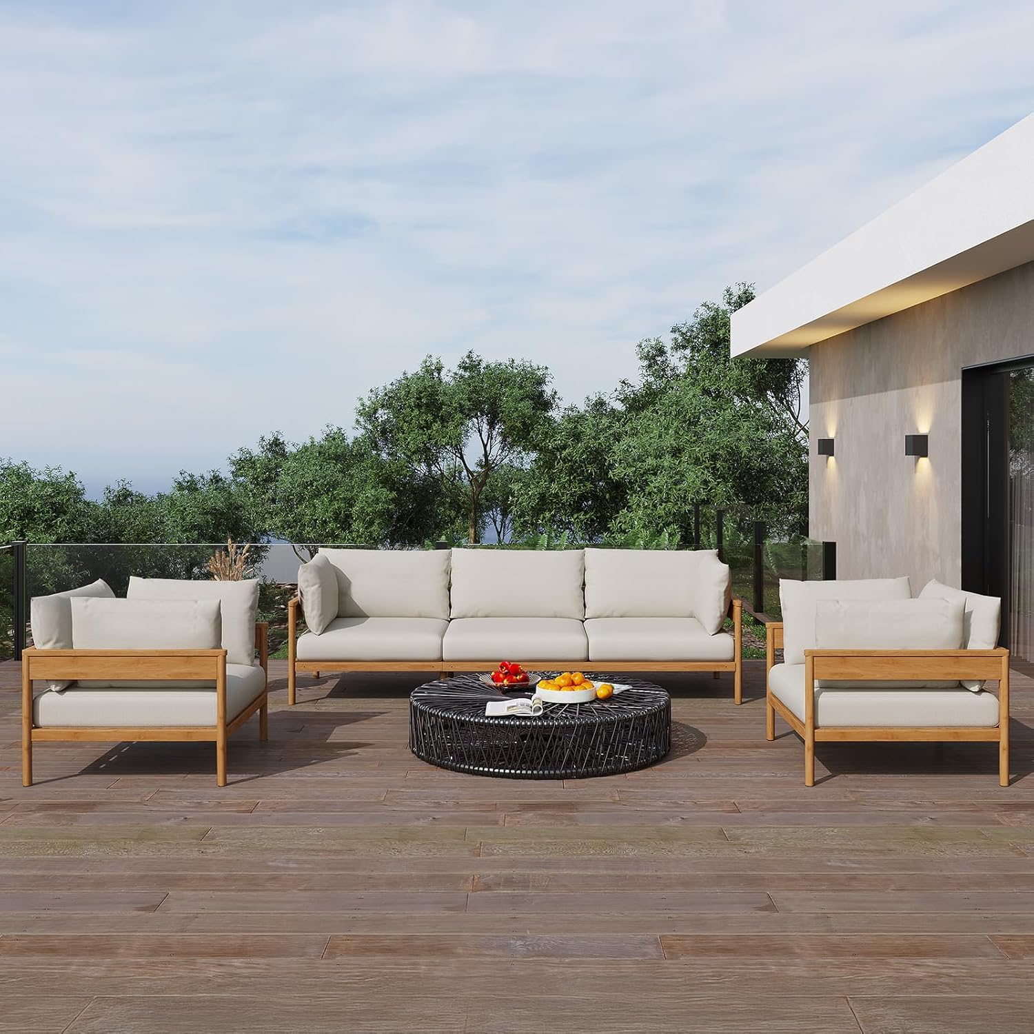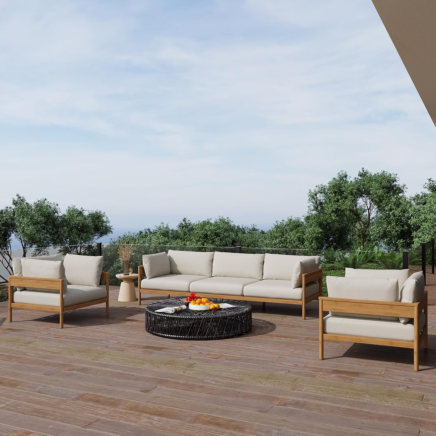 - Premium Construction: The sturdy aluminum frame with teak wood-toned finish and stainless steel hardware ensures the L-shaped patio couch will maintain its structural integrity season after season.