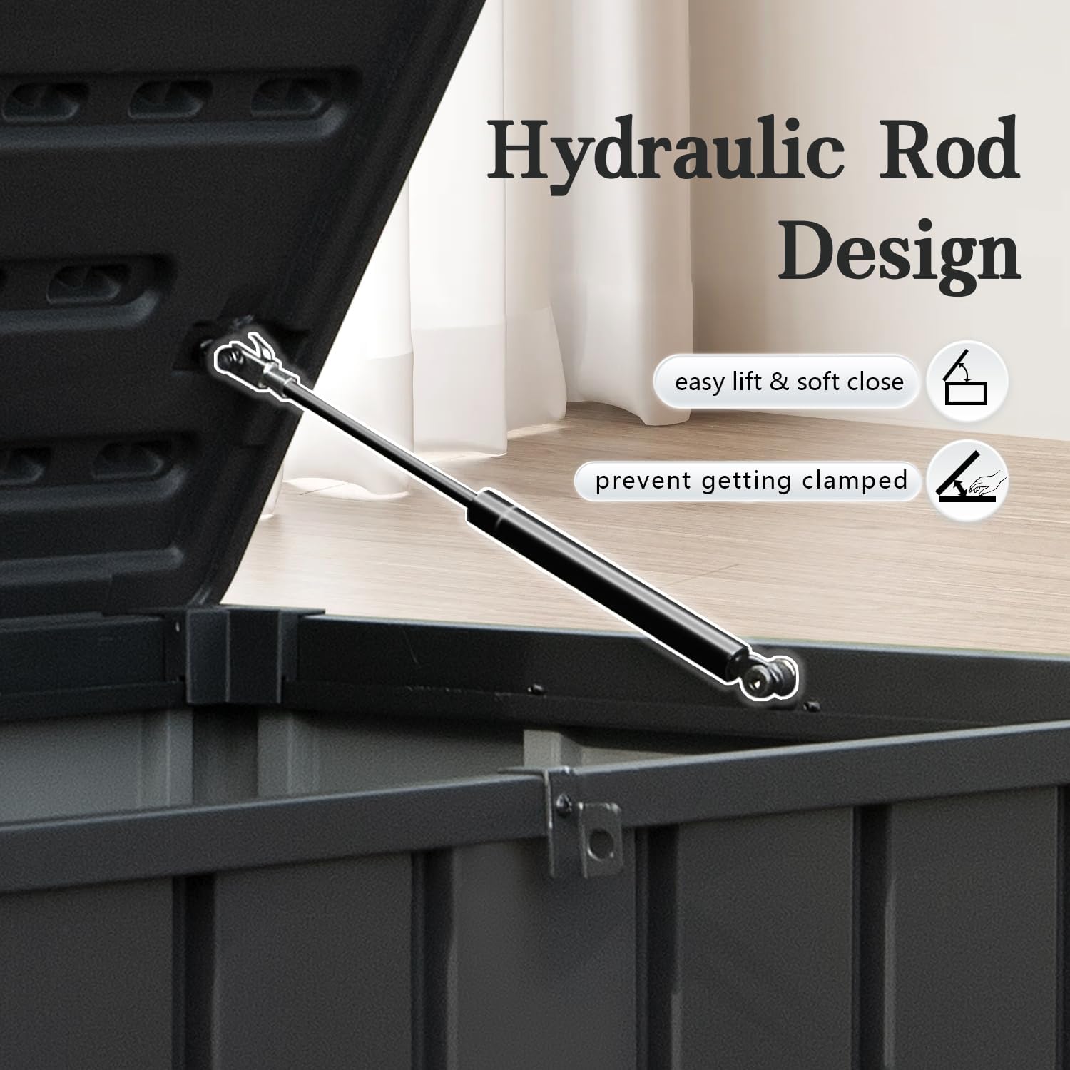 - Smooth Hydraulic Lid – Two hydraulic air rods ensure effortless opening and gentle, controlled closing, reducing the risk of pinched fingers for safe and hassle-free use.