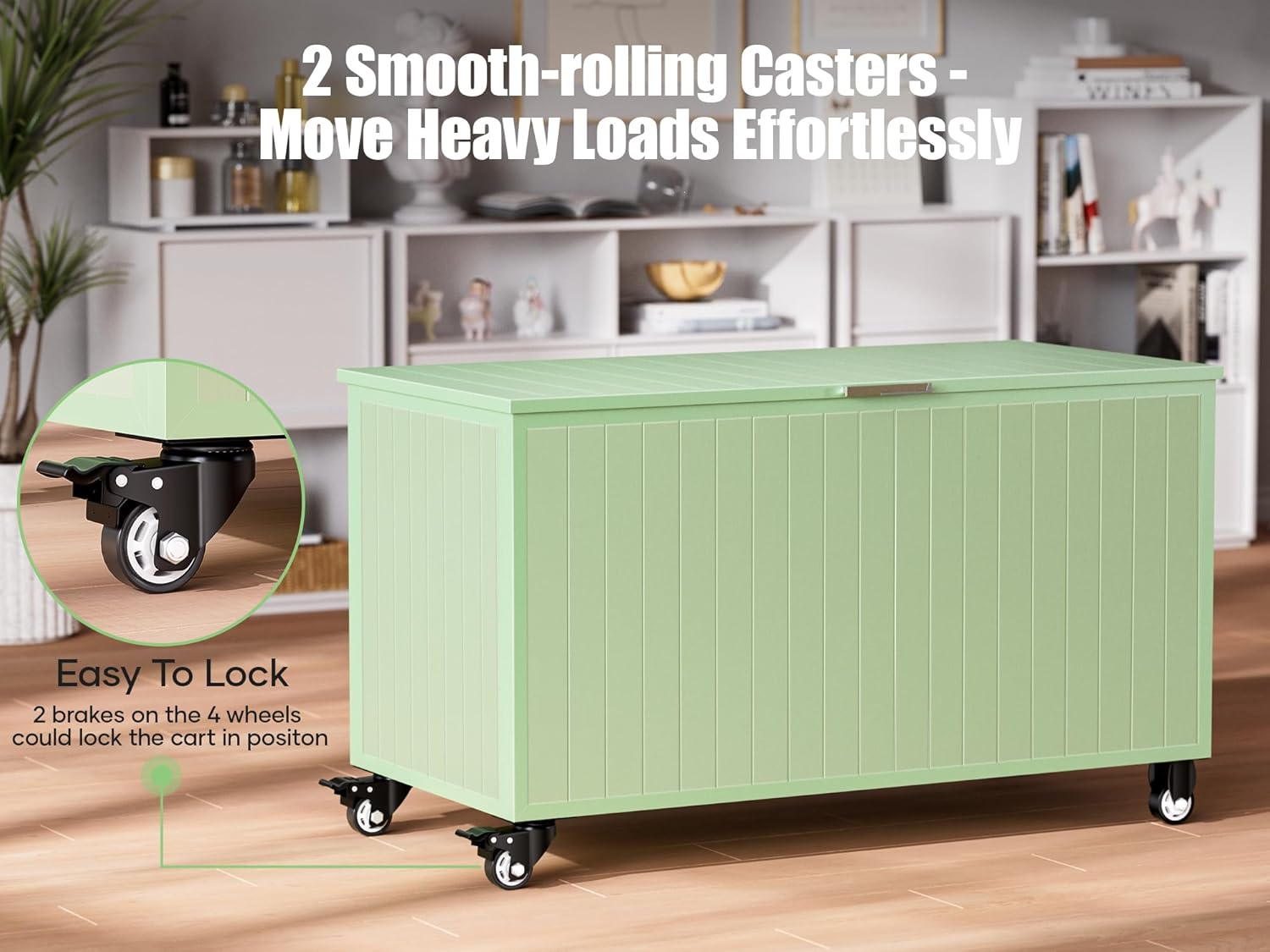 - Wheeled Storage Design: The Deck Box features wheeled storage, offering convenient mobility. This thoughtful design allows you to easily move the storage box around your outdoor space, making it convenient to access whether you are indoors or outdoors.