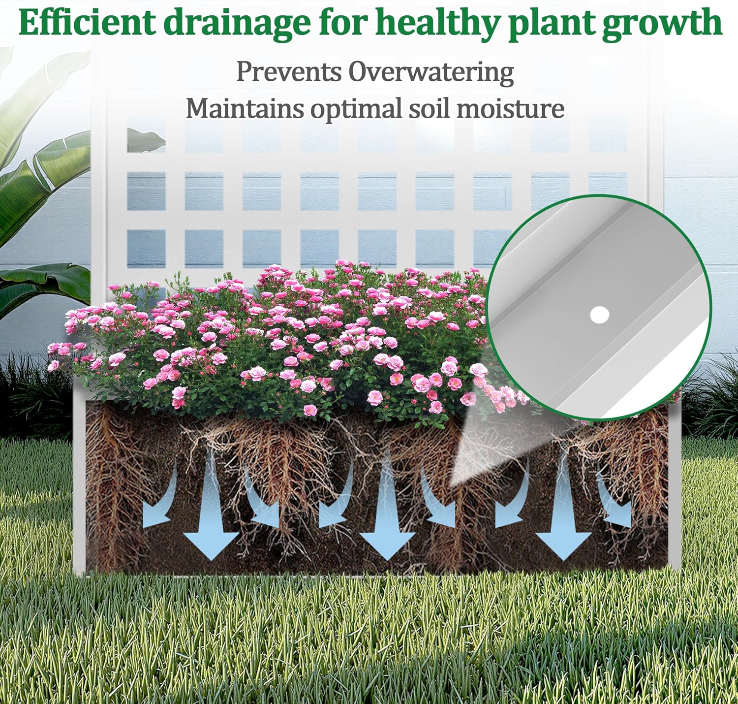 - Optimal Water Management: The planter with trellis features a deep planting bed, offering generous space for healthy root development. The raised garden bed also comes with built-in drainage holes that efficiently prevent water accumulation, helping your plants maintain proper moisture levels for optimal growth.
