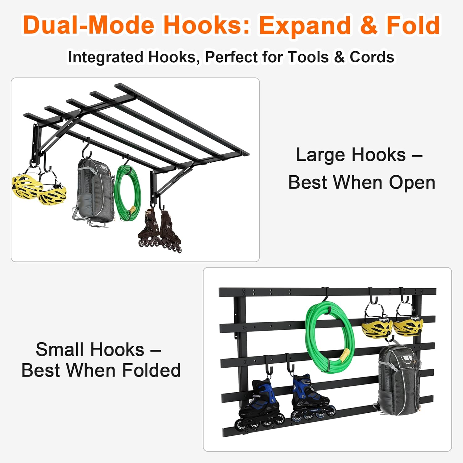 - ๐๐ง๐ญ๐๐ ๐ซ๐๐ญ๐๐ ๐๐จ๐จ๐ค๐ฌ ๐๐จ๐ซ ๐๐๐ฌ๐ฒ ๐๐ซ๐ ๐๐ง๐ข๐ณ๐๐ญ๐ข๐จ๐ง: This garage wall shelf includes sturdy hooks for hoses, cords, and tools. Perfect garage wall shelves for decluttering, it turns chaos into neat, accessible garage shelves wall mounted storage.