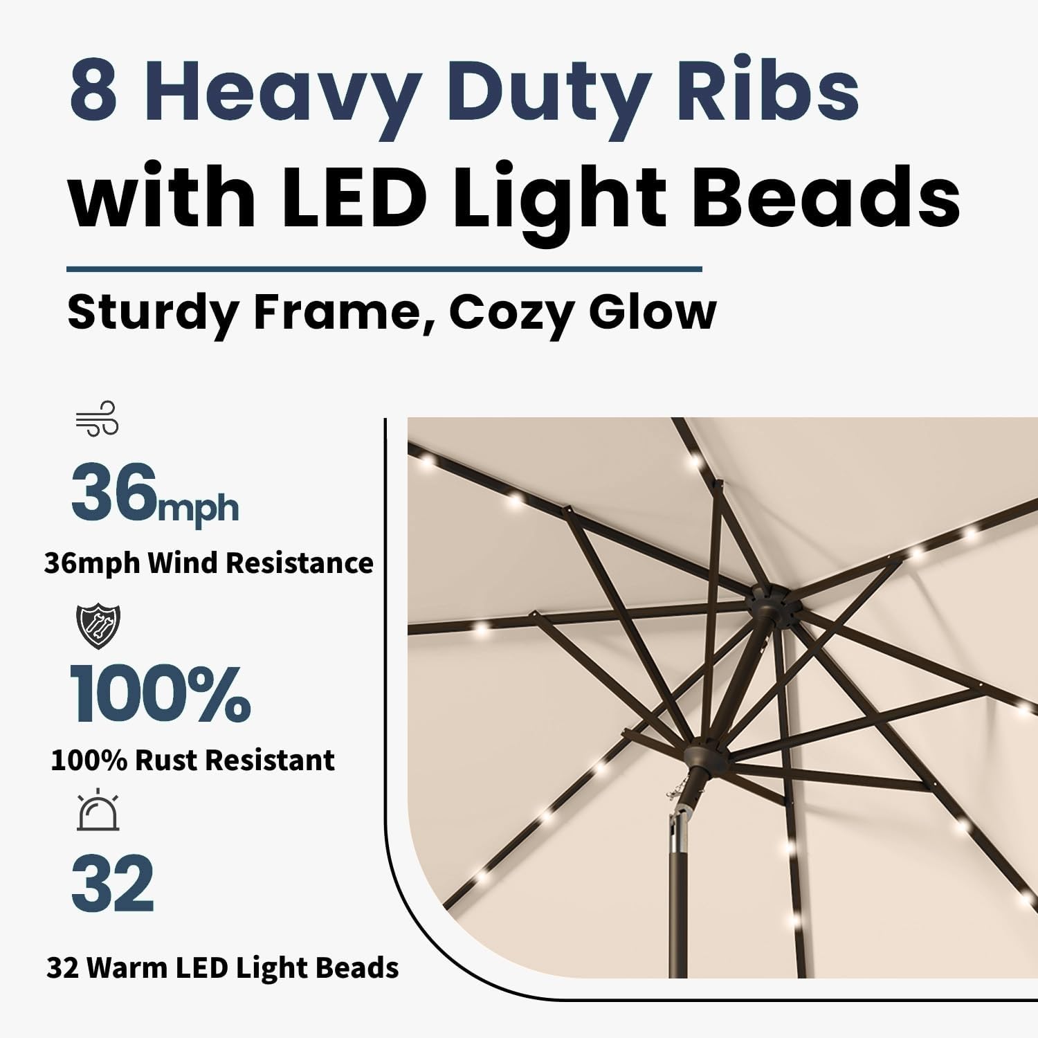 10FT Solar Umbrella 32 LED Lighted Patio Umbrella Table Market Umbrella w/Tilt and Crank, UV-Resistant Outdoor Umbrella for Pool, Garden, Deck, Beige