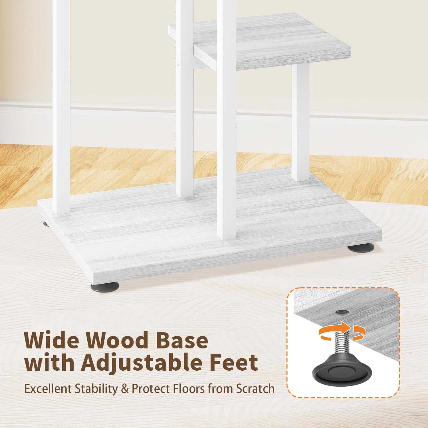 - 【Balance on Any Surface】Uneven floors? No problem. The adjustable feet adapt to tile, carpet, or wood—keeping your tiered plant stand level and secure after a quick adjustment. They also protect your floors from scratches. No shaking, no damage—just easy movement and worry-less decorating.