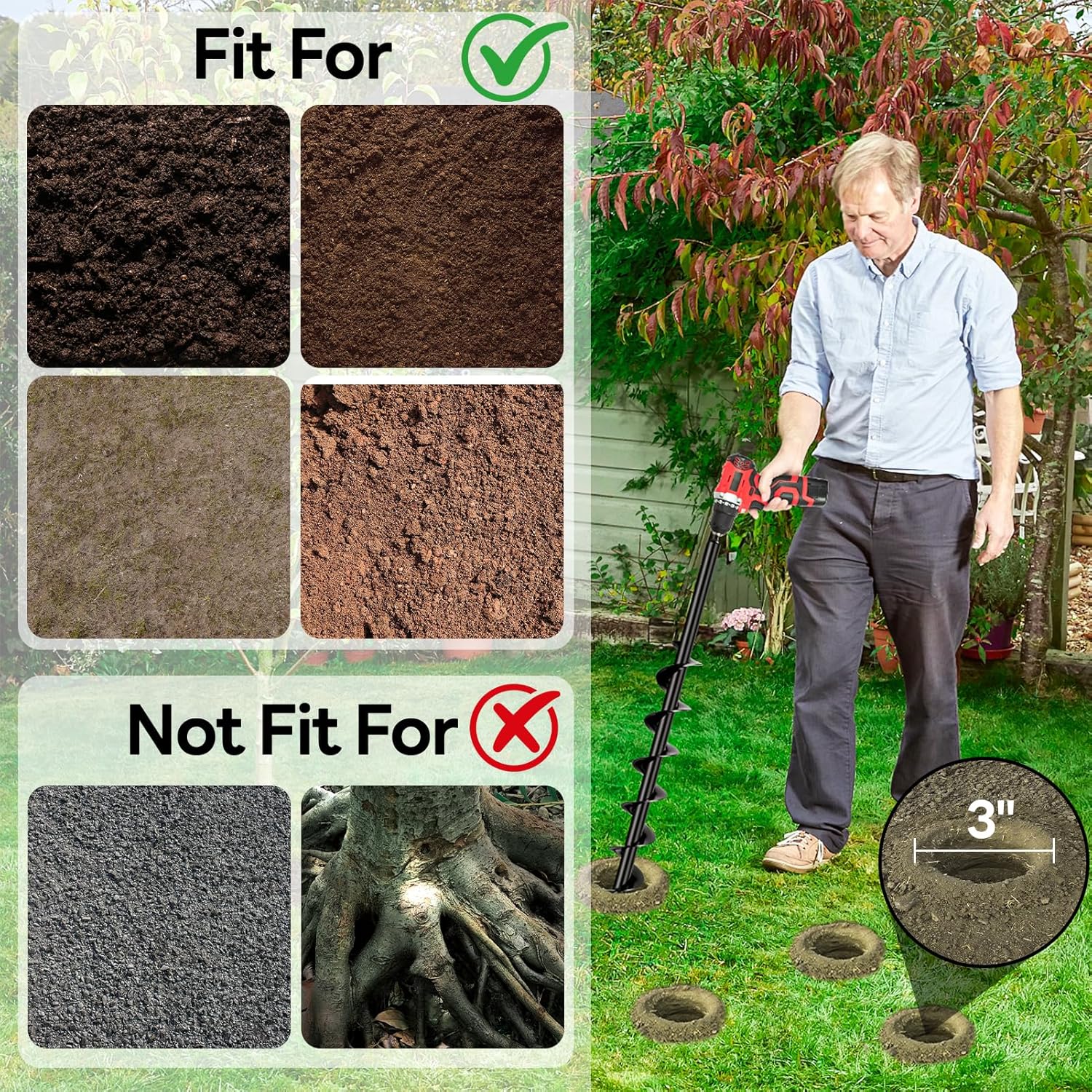 - Suitable Soil Types: Our garden drill auger perform best in sandy, loam and relatively soft clay, ensuring efficient and precise drilling. Note: It is not recommended to use in soil with many rocks or dense root systems