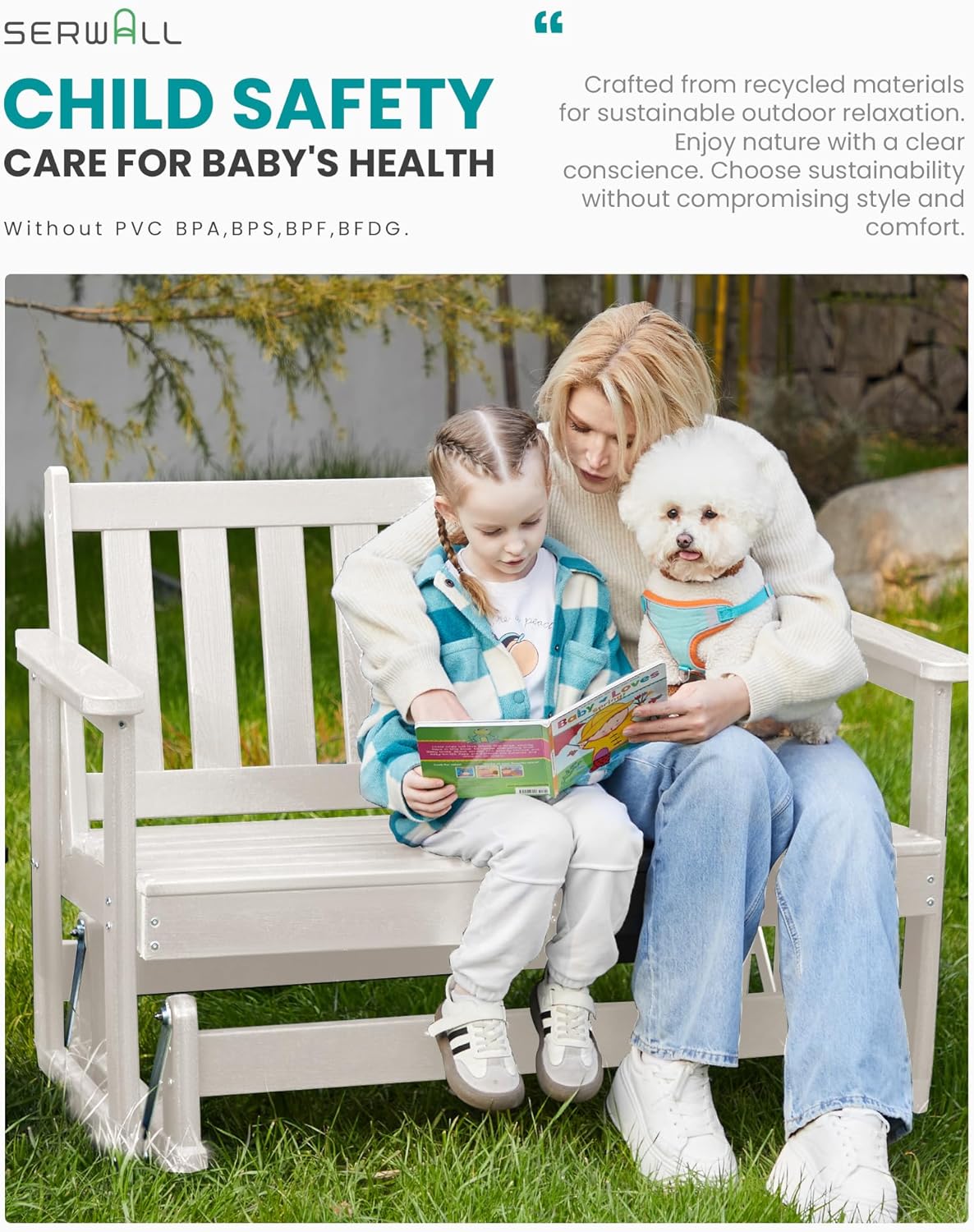 - [All Weather Resistant] Made with durable HDPE material and stainless steel hardware, the SERWALL glider rocking chair is built to withstand all weather conditions, ensuring long-lasting durability. The easy-to-clean surface and ability to swing add an extra level of comfort to your outdoor space, making it ideal for use in any outdoor setting.