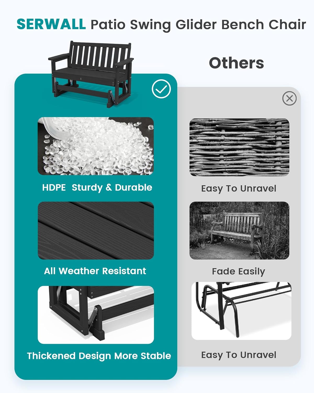 - [All Weather Resistant] Made with durable HDPE material and stainless steel hardware, the SERWALL glider rocking chair is built to withstand all weather conditions, ensuring long-lasting durability. The easy-to-clean surface and ability to swing add an extra level of comfort to your outdoor space, making it ideal for use in any outdoor setting.