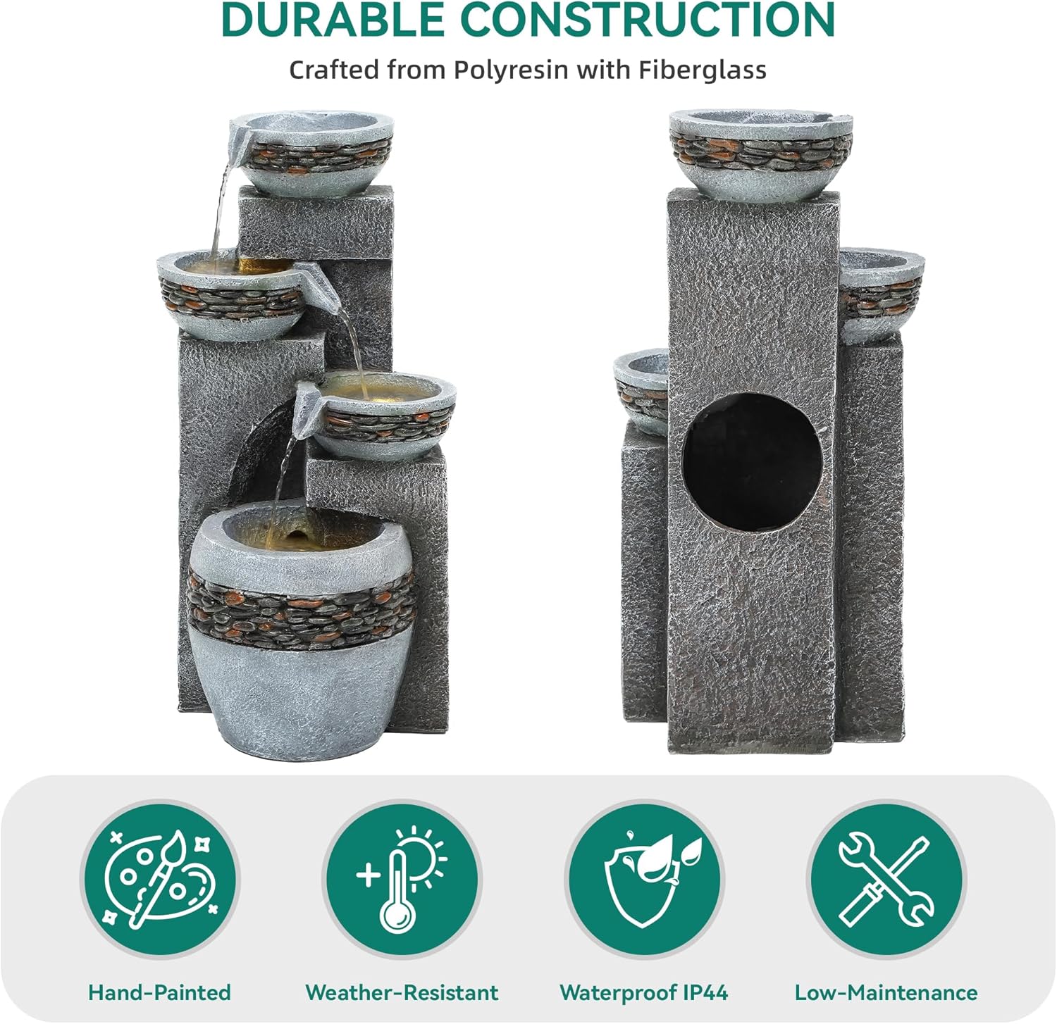 - SOOTHING CASCADING WATER: The intriguing cascading water of this outdoor fountain transforms your outdoor space into a soothing oasis. Whether you're seeking a moment of deep meditation, a relaxing retreat, or a place to unwind after a long day, this fountain makes a serene addition to your patio, turning it into a haven of tranquility.