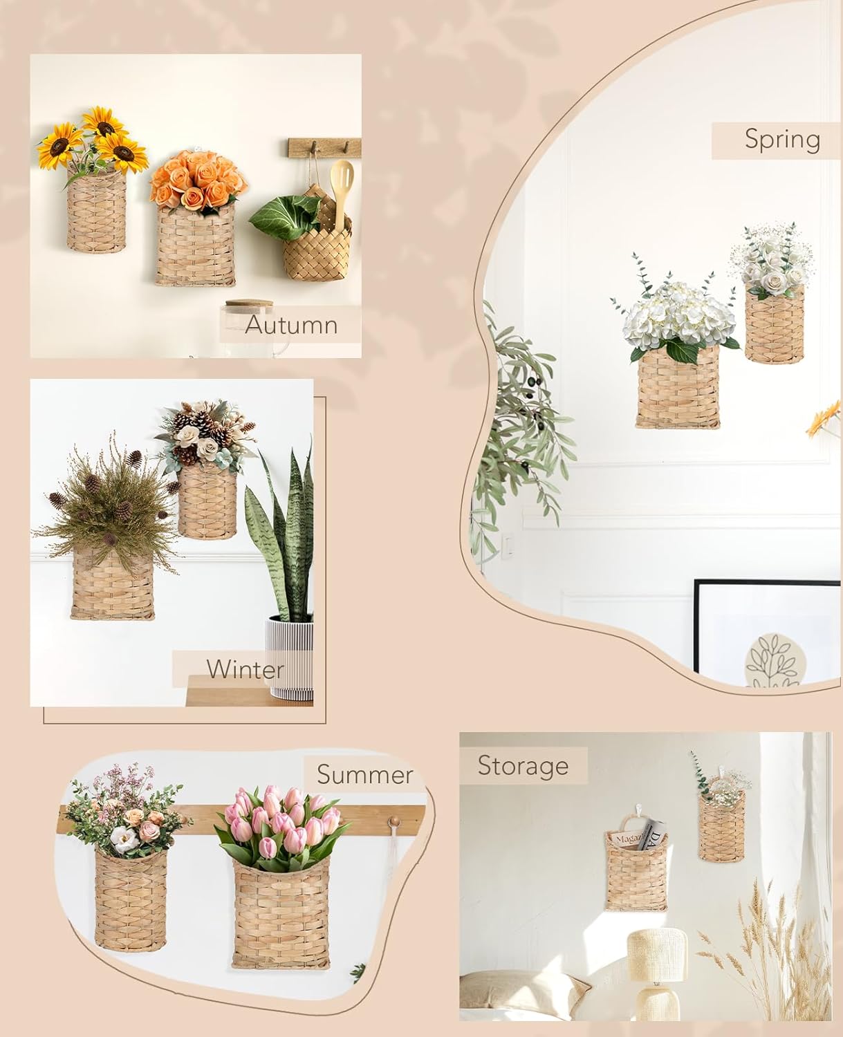 - 【Seasonal & Year-Round Wall Decor】 Decorate for fall with sunflowers, for winter with pinecones, or refresh with spring blooms. Whether for Thanksgiving, Christmas, or everyday style, these baskets adapt to every season and celebration.