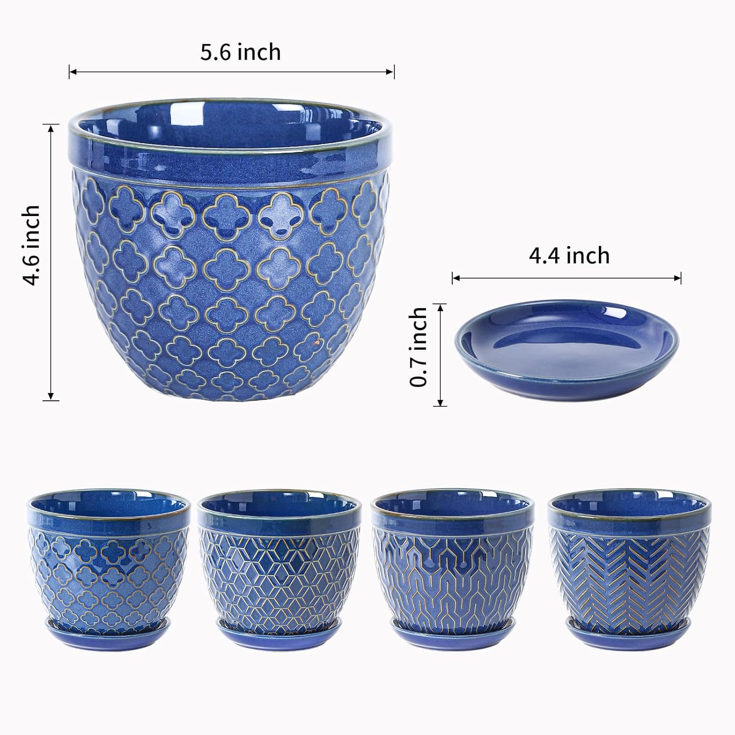 Sureasy Ceramic Indoor Plant Pots - 5.6 Inch Flower Pots for Plants with Drainage Hole and Saucer, Embossed Planter for Succulents, Orchid, Cactus, Indoor Home Decor, Set of 4, Blue