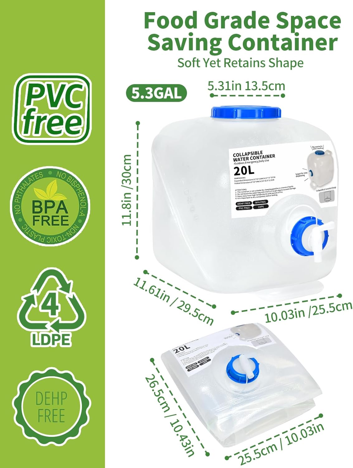 - Premium Collapsible Water Container - BPA-Free & Food-Safe: Crafted from food-grade LDPE plastic, this heavy-duty container features upgraded molded construction. It contains no BPA, PVC, or DEHP, ensuring safety. Unlike typical PVC containers, it's completely odor-free and won't impart plastic tastes to your water. Built for resilience, it withstands temperatures from -4°F to 176°F (-20°C to 80°C).