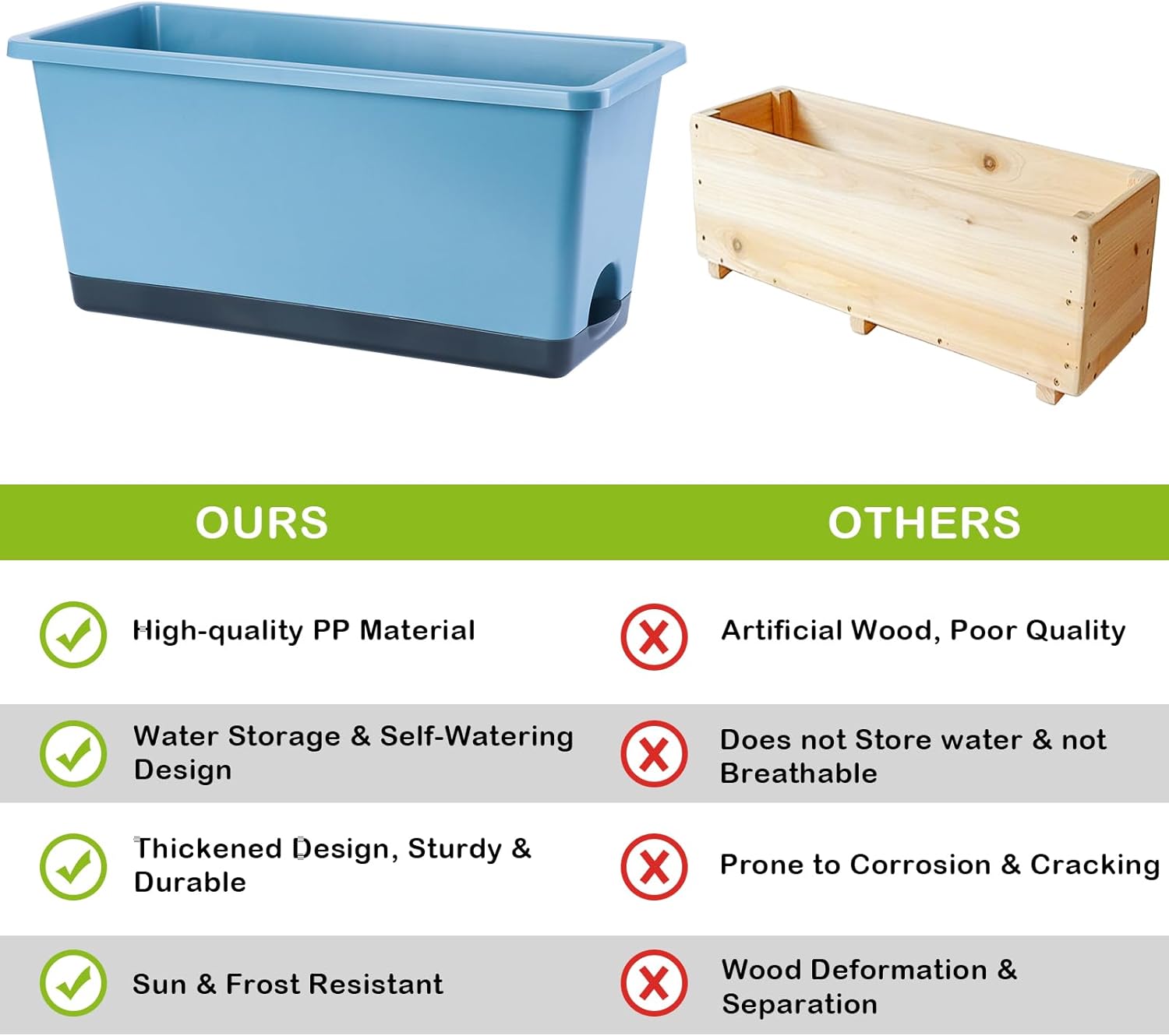 - 【Premium & Durable】The planter pots are made of high quality PP material and has been thickened to bear up to 300KG (660LB). This window box planter is sturdy, wear-resistant and durable. It can be exposed to light, wind, and sunlight for long periods of time, with a lifespan of decades. It is an excellent planter box for both indoor and outdoor.