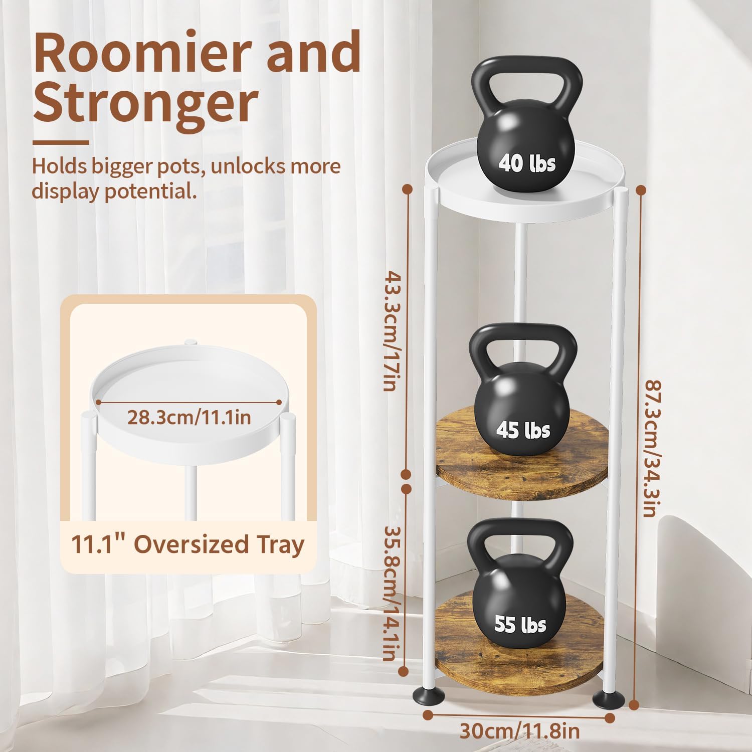 - 【Large Trays for Bigger Plants】Our upgraded 11.1-inch wider trays offer more space than most on the market, giving you plenty of space for larger planters. Each tray can hold over 40 pounds, making it a perfect fit for those hefty cement pots that other plant holders just can't handle.