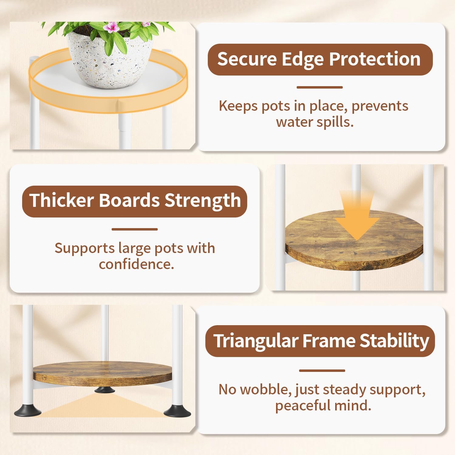- 【Adjustable Feet for Any Surface】 No need to worry about uneven floors! Our corner plant stands for indoor plants features three adjustable feet that keep it perfectly balanced, whether it’s on carpet, tile, or hardwood—plus, they also protect your floors from scratches.