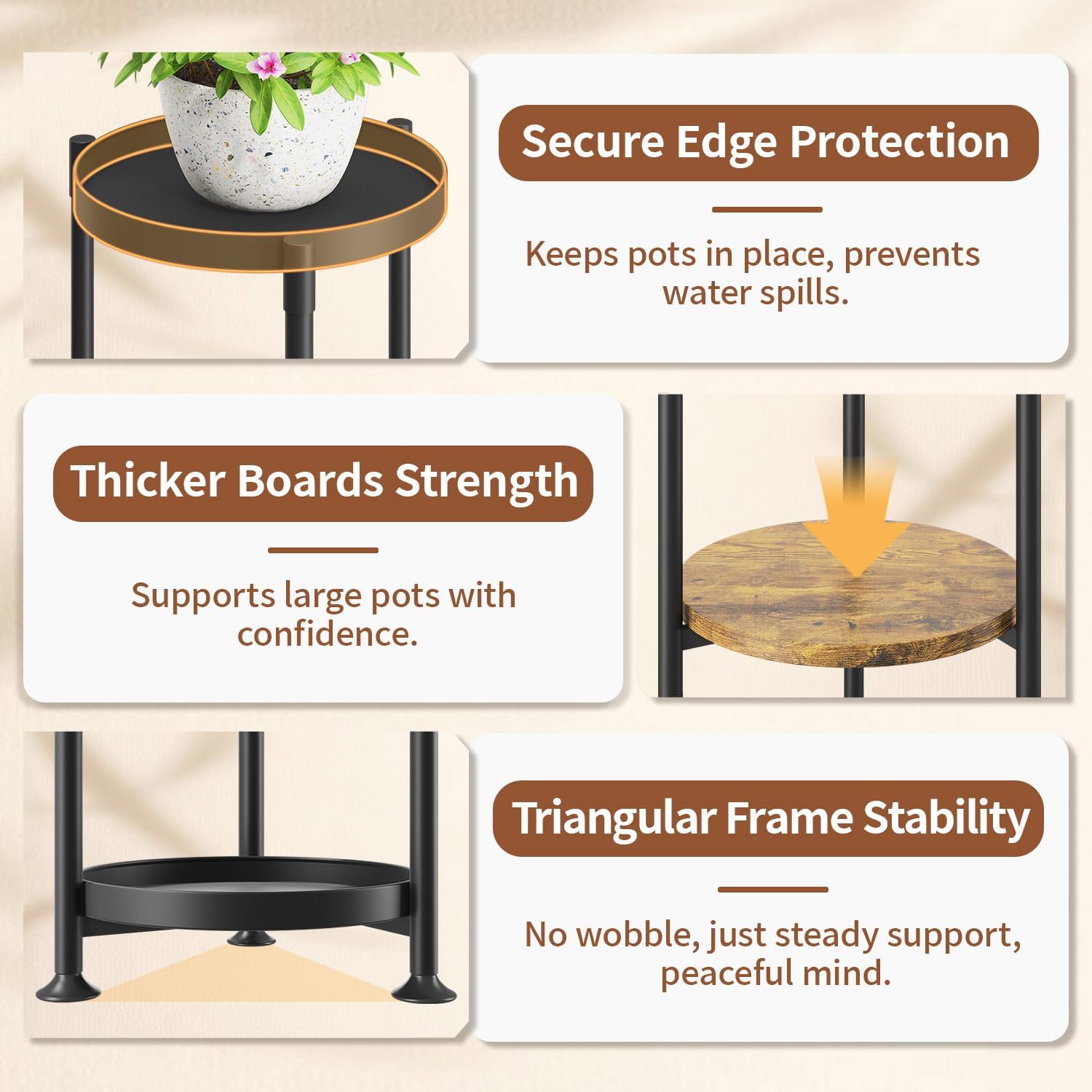- 【No More Water Spills】The top tray of the plant stand corner has a raised edge to prevent any plants from slipping off while also preventing water from spilling during watering. You won’t have to worry about water stains on your floors or carpet anymore!