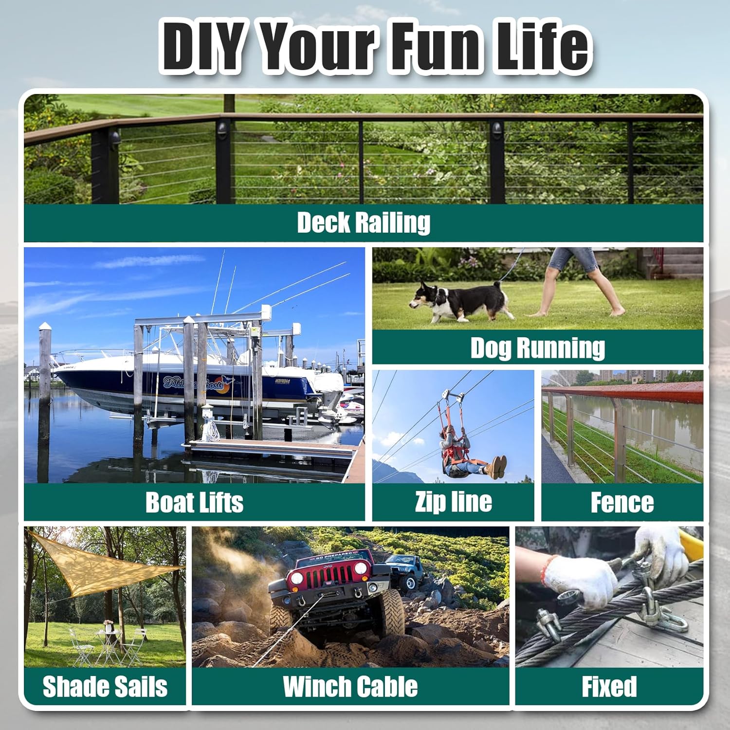 - Complete wire rope kit: The kit includes a 50ft steel cable, 8*M6 wire rope clips and 8*M6 wire rope thimbles to help your operation become simple and efficient.