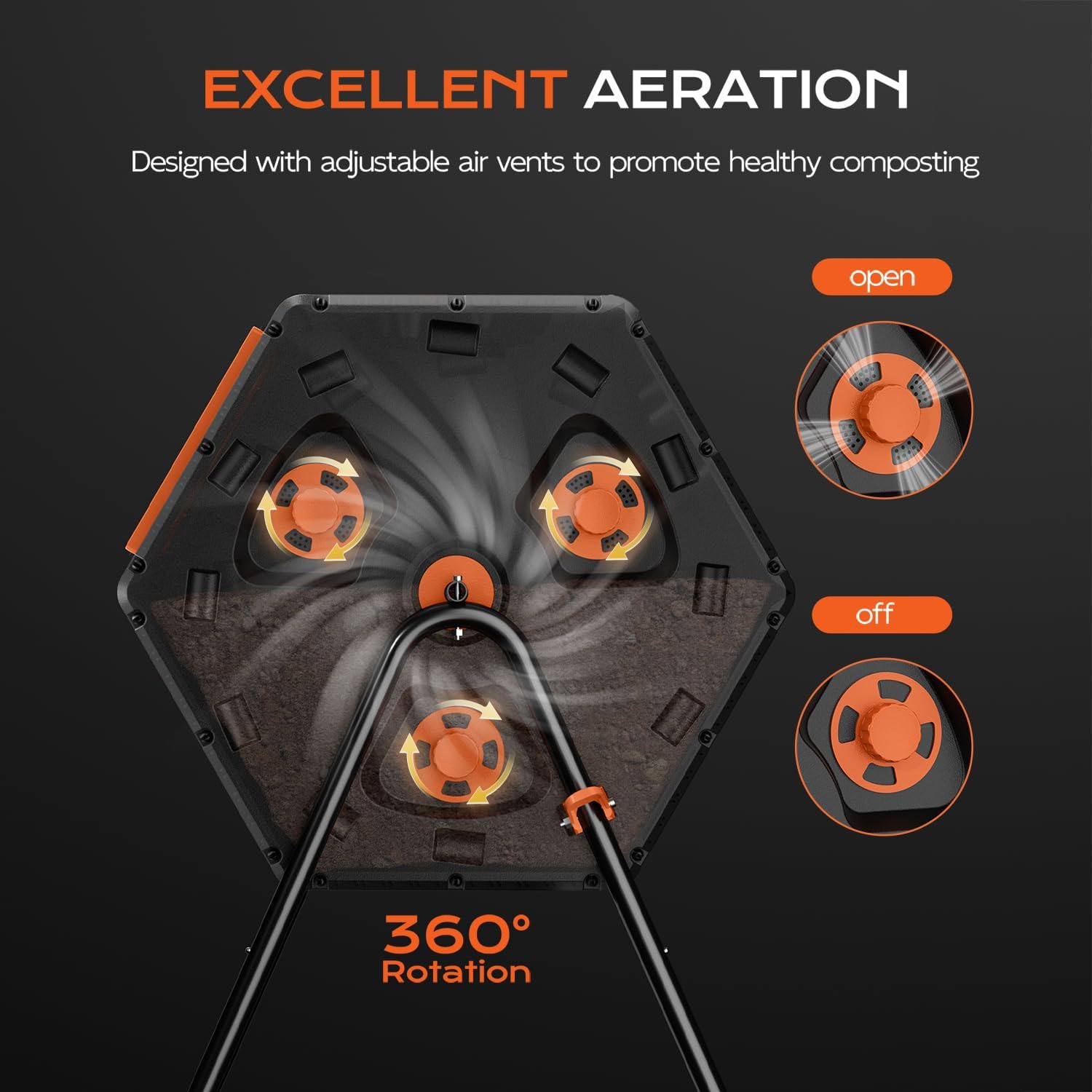 - 【Smart Ventilation Control】The compost tumbler features adjustable vents to regulate moisture, oxygen & temperature. Easily open/close them to manage moisture, oxygen, and temperature. Prevent odors during active phases or retain heat for faster breakdown