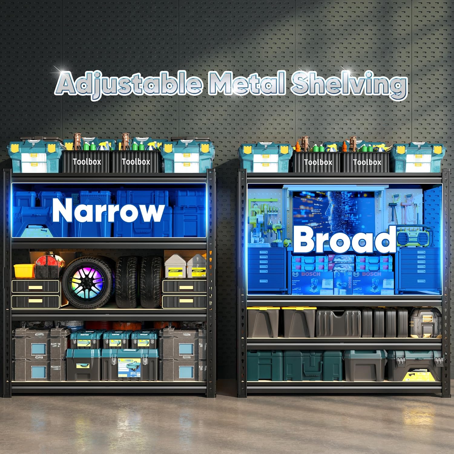 - ăAdjustable Garage ShelvesăThe height of this shelving unit is adjustable. You can move the shelves up and down to optimize space utilization and meet various storage needs. Additionally, it can be split into two separate units that function as workbenches