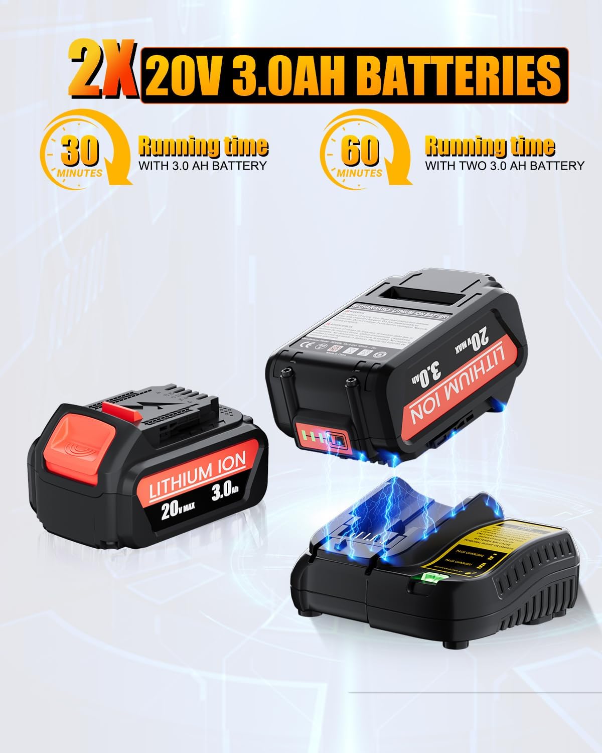 - Upgrade to 2 Batteries and 1 Fast charger: The Nyveyoo Cordless Leaf Blower comes with two 20V 3.0Ah batteries and a quick charger for up to 30 minutes of use at maximum power and 60 minutes at medium power. The batteries are compatible with all DEWALT 20V tools and chargers, ensuring versatility. With the quick charger, the batteries can be fully charged in just 2 hours, minimizing downtime and ensuring you work efficiently.