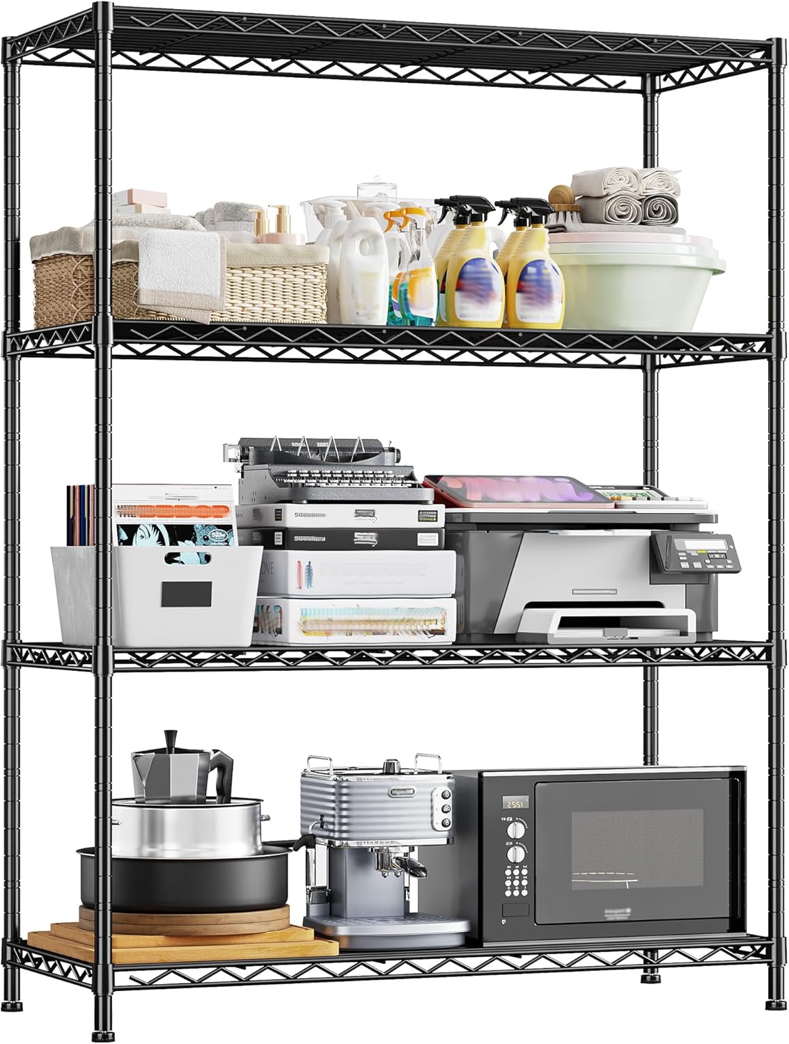 4- Shelf Metal Shelving Unit Adjustable Storage Shelves Heavy Duty Garage Shelving Steel Wire Shelving for Laundry Bathroom Kitchen Pantry Closet Garage Black, 35.6Wx16Dx54H