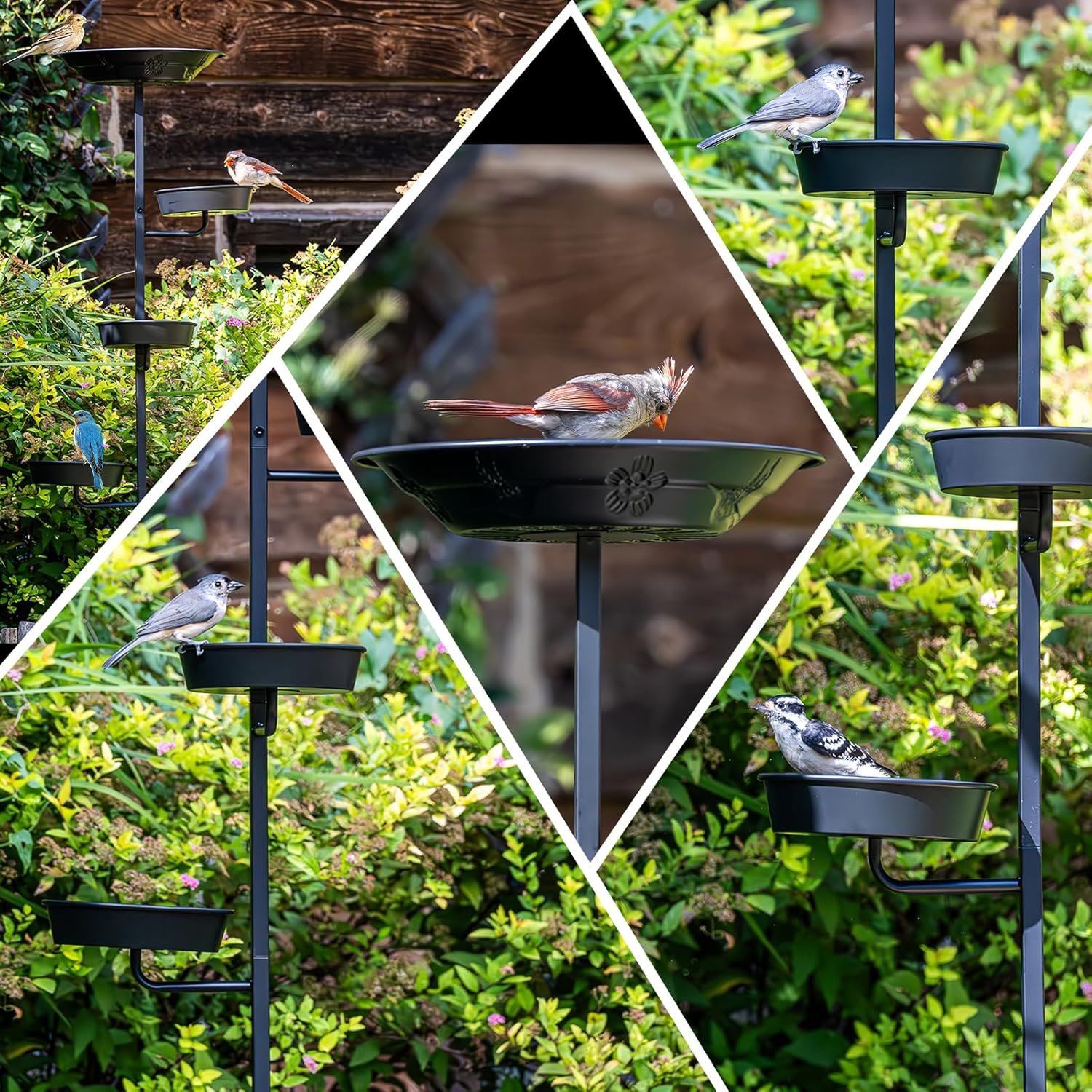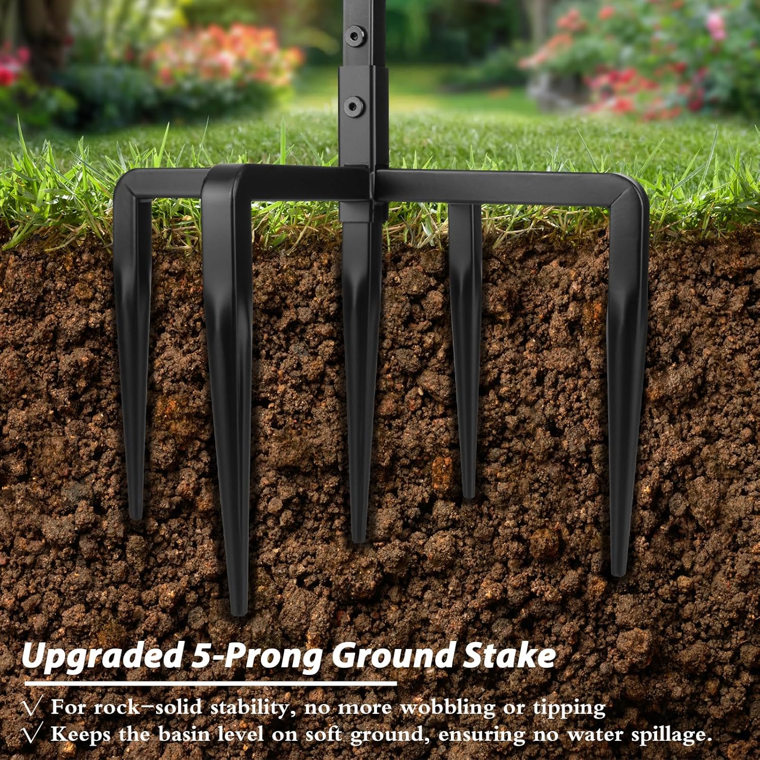 - Sturdy 5-Pronged Base: The bird bath for outside features an all-metal construction with a 5-prong base to prevent tipping and ensure stability in the soil. The black coated surface is rust-resistant and can withstand all weather conditions