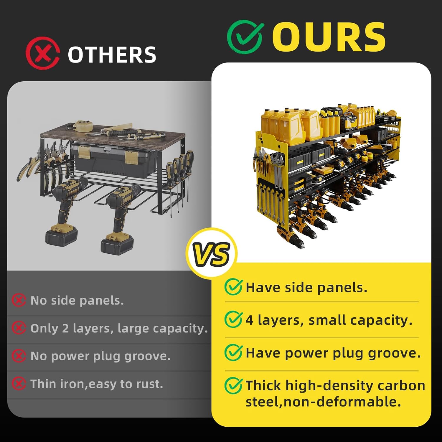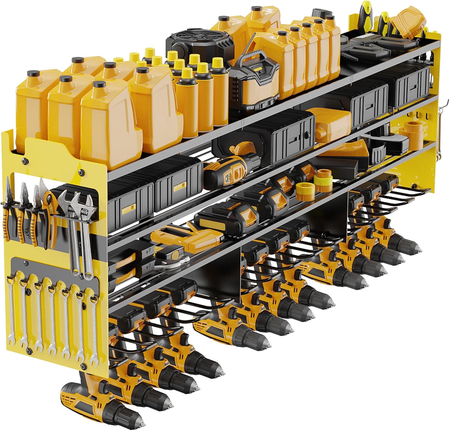- 🔧【LARGE CAPACITY&SIDE PLATE】This wall-mounted power tool organizer is more storage space than standard tool racks.It has 4-layer high-capacity design and 12 cordless drill holders and 2 side-plates, great for storge electric drills/power drivers/impact wrenches/mpact drills/cutters/angle grinders and other handheld power tools.The 4-layer can hold batteries, saws,wrenches,chargers and other tools, and the side racks can hold wrenches/screwdrivers/hammers/pliers, scissors, etc.