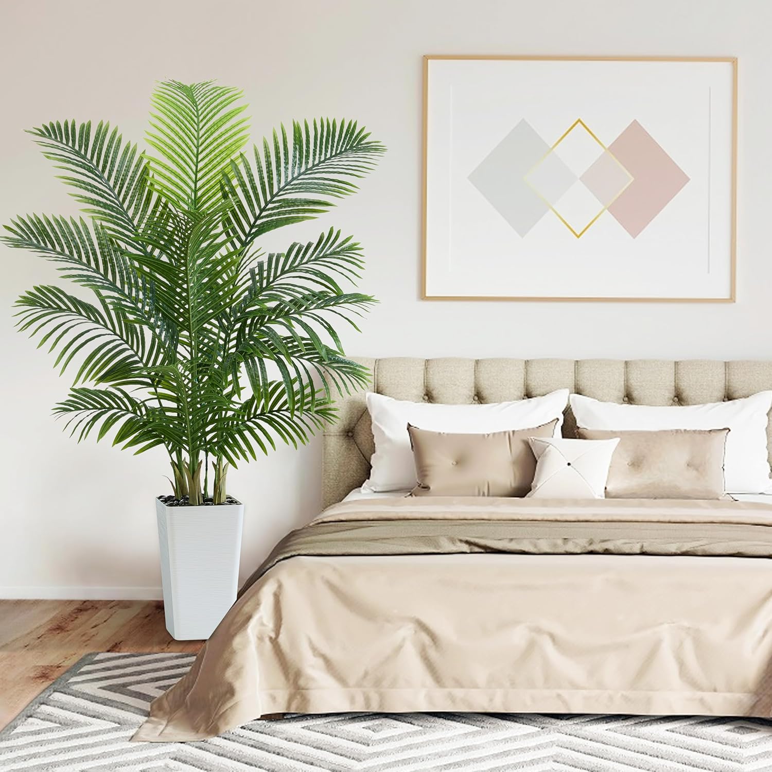 - [Zero Maintenance. Zero Stress.] No green thumb? No problem. This artificial areca palm tree is designed for effortless living—it stays vibrant and full all year round without watering, trimming, or direct sunlight. Whether you’re a busy professional or simply prefer worry-free décorthis faux palm delivers consistent beauty with no upkeep. The UV-resistant materials help preserve its rich color indoors, so it won’t fade or wither with time. Giving you more time to relax and enjoy the view.