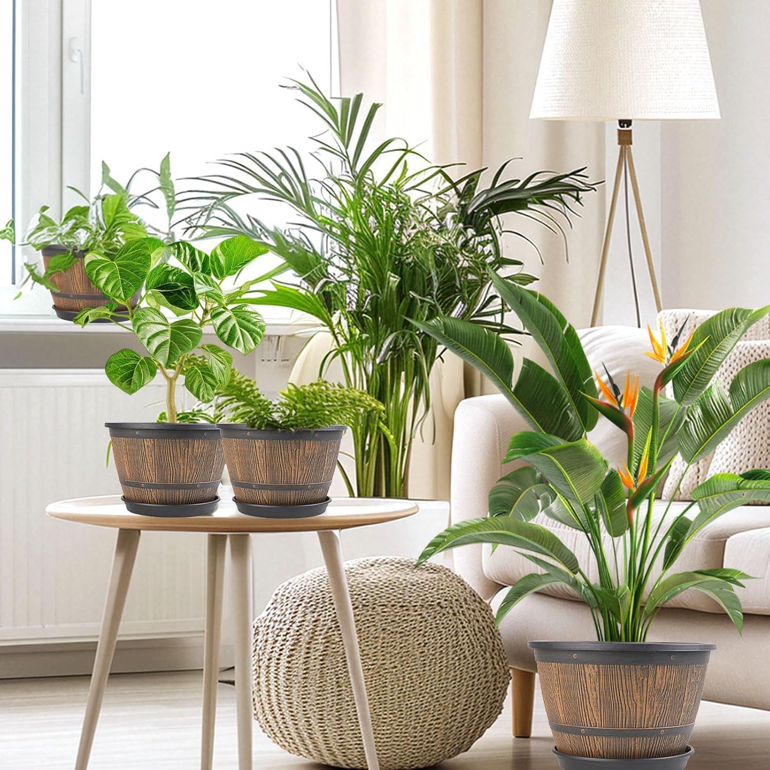 - 【Decorative Planters】Plastic pots for plants are perfect for indoor outdoor---decorating your windowsill, desktop, living room, kitchen, bedroom, bookshelf,balcony, garden, porch, patio and so on. These whiskey barrel indoor planters are a must-have for plant lovers. Give your plants a stylish home while bringing your green dreams to life!