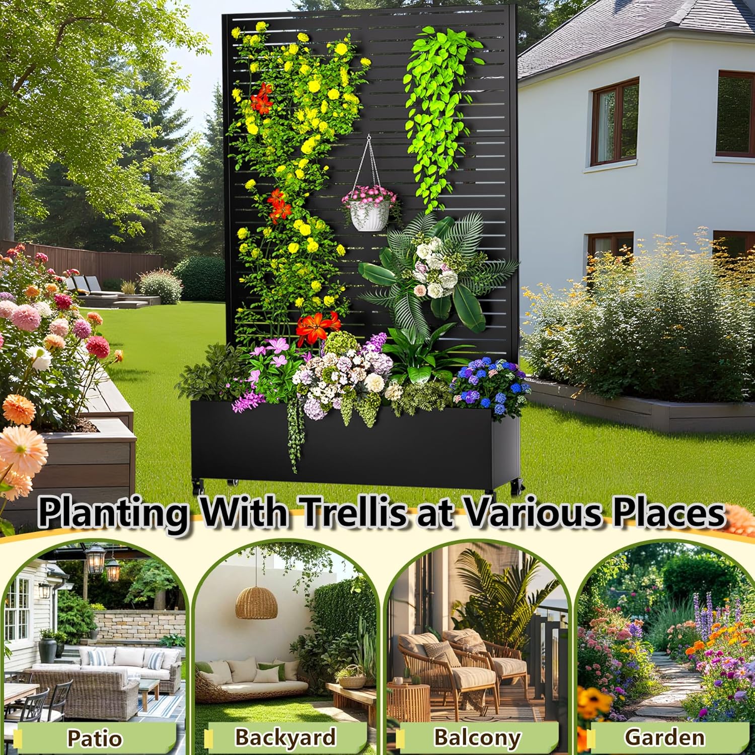 - 【Privacy Screening & Decorative Appeal】This metal planter box with trellis doubles as an elegant privacy screen and decorative fence, ideal for concealing unsightly objects like AC units, pool pumps, or trash cans, and creating natural partitions on decks, patios, and backyards, blending function with outdoor aesthetics.