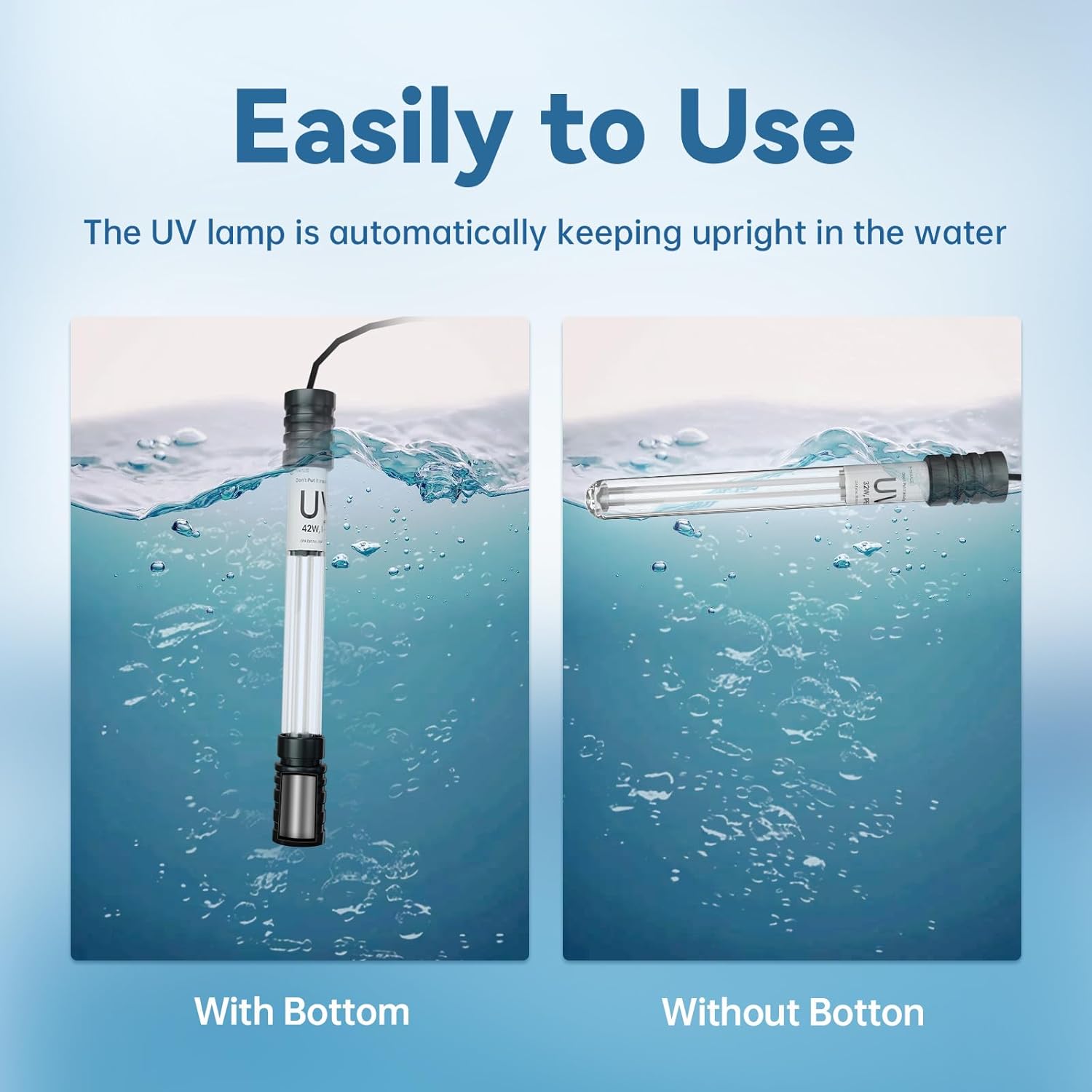 - Easily to Use: The submersible UV light for pond features a weighted base that ensures it automatically keeps upright in the water, achieving 360° thorough cleaning. In addition, koi pond UV light's double-sealed waterproof construction with a silicone protective cork and PVC cap delivers maximum ingress protection, ensuring reliable deep-water operation. The recommended maximum immersion depth is 50 cm below the water surface.