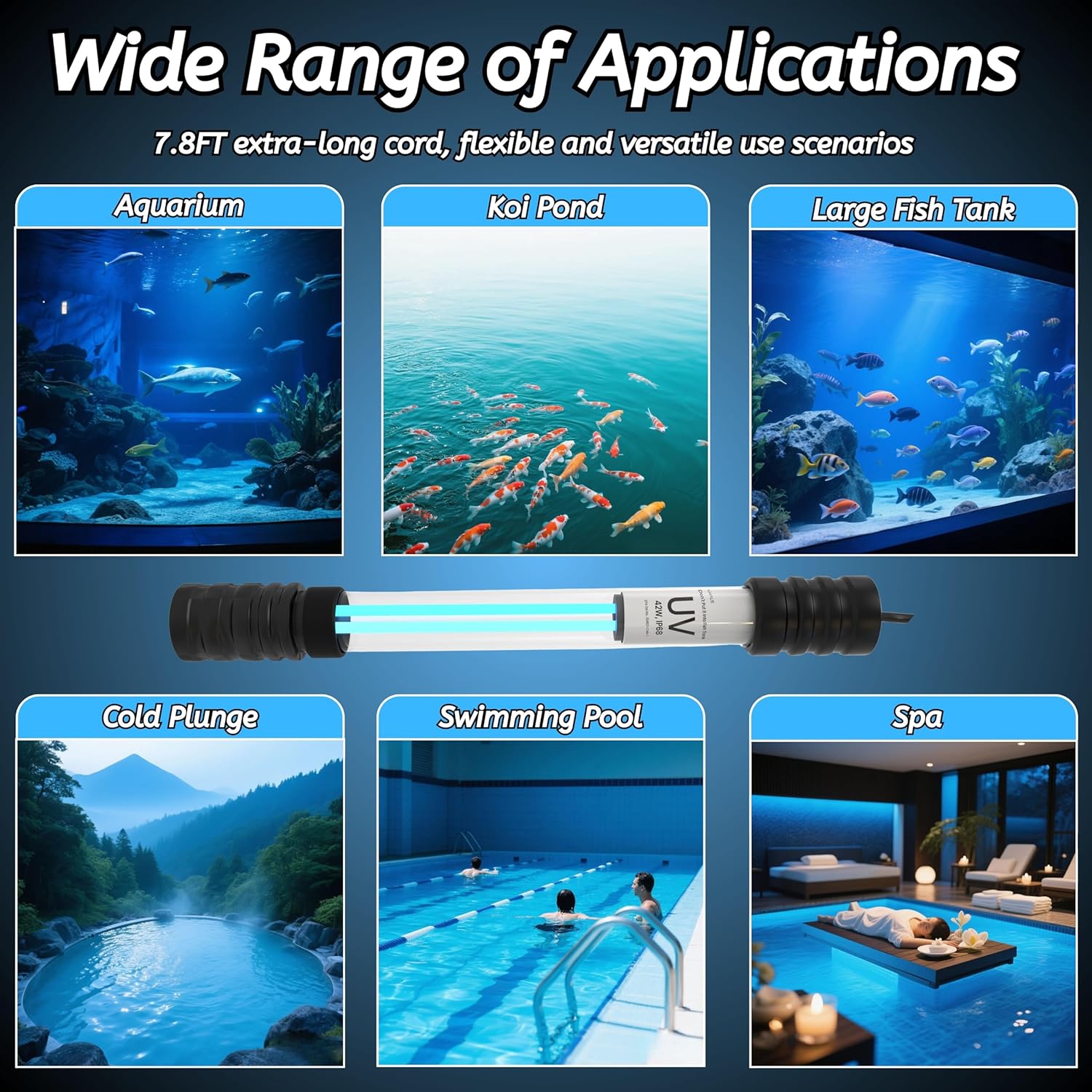 - Efficient: This professional pond UV light engineered with precision UV-C light at 254 nm effectively eliminates up to 99.99% of harmful algae, clears cloudy water and removes odors. Its 254nm wavelength is optimal for breaking down algae D-N-A, preventing reproduction. Designed for ponds, aquariums and spas, the UV light for ponds koi outdoor features a long 10,000-hour lifespan and includes a 240 cm power cord for easy installation.