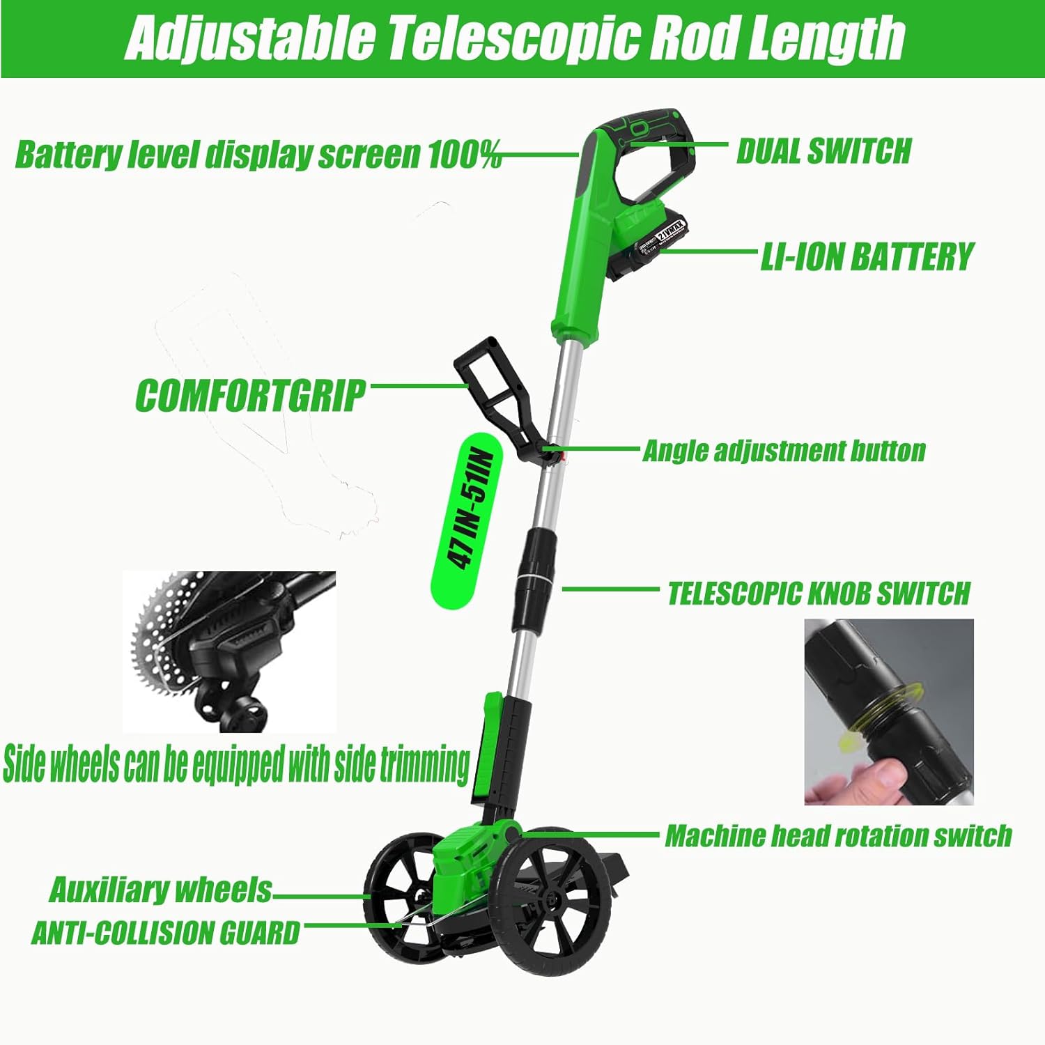 - ADJUSTABLE HEIGHT & ROTATING HEAD: The handle adopts ergonomic design Adjustable length of telescopic shaft which total length is about 41- 57inch, weight is only 4.5 pounds, The angle of the String Trimmer Cordless head can be adjusted (0-90Β°) at will to fit for most complex working environments. women and the elderly can easily use. allowing you to easily care for any hard-to-reach nooks and crannies