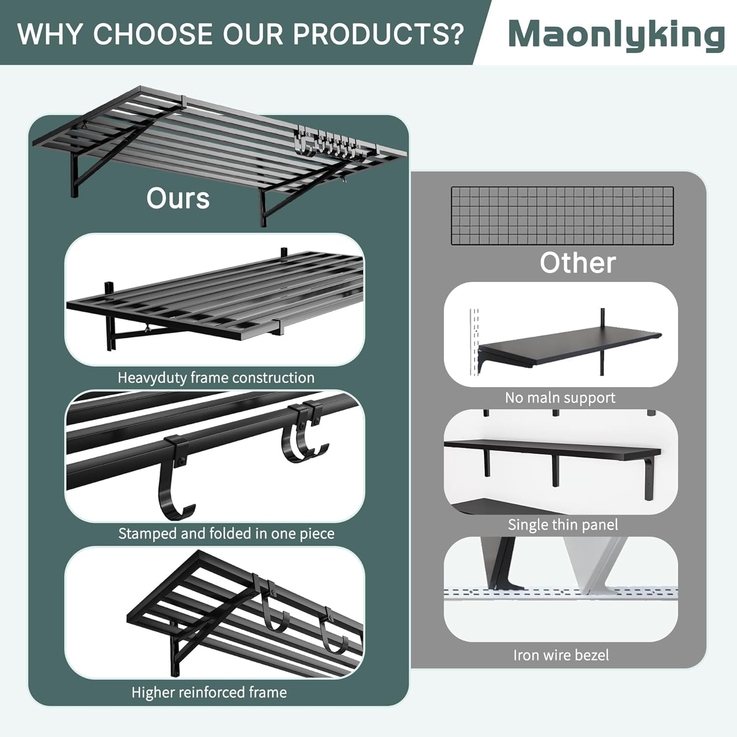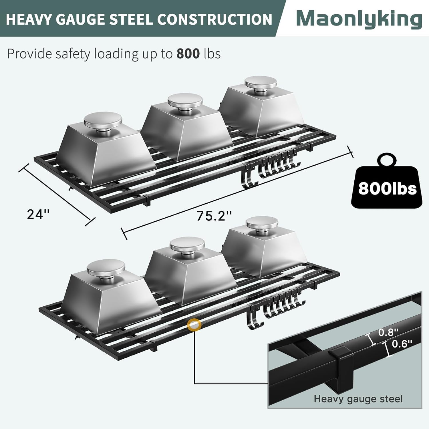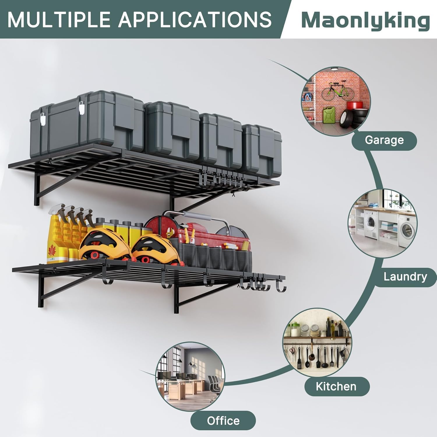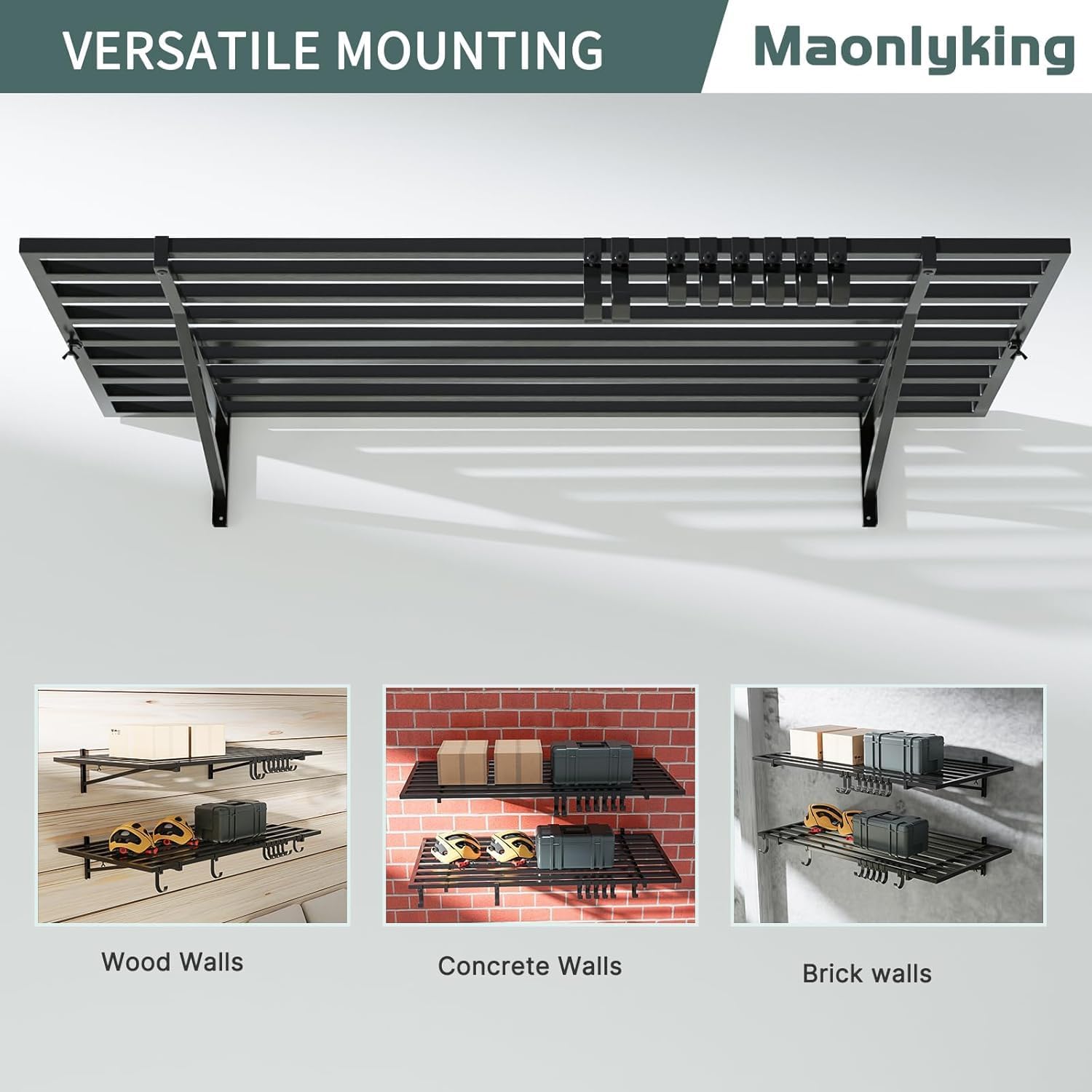 - 【Heavy Duty Steel】 Our garage wall shelving is made of heavy-duty steel structure,with upgraded slatted layer board design. Maonlyking 2' x 4' shelves and wall brackets are made from solid steel square tubing for maximum strength. Each shelf supports up to 250 lbs for a combined load capacity of 500 lbs.