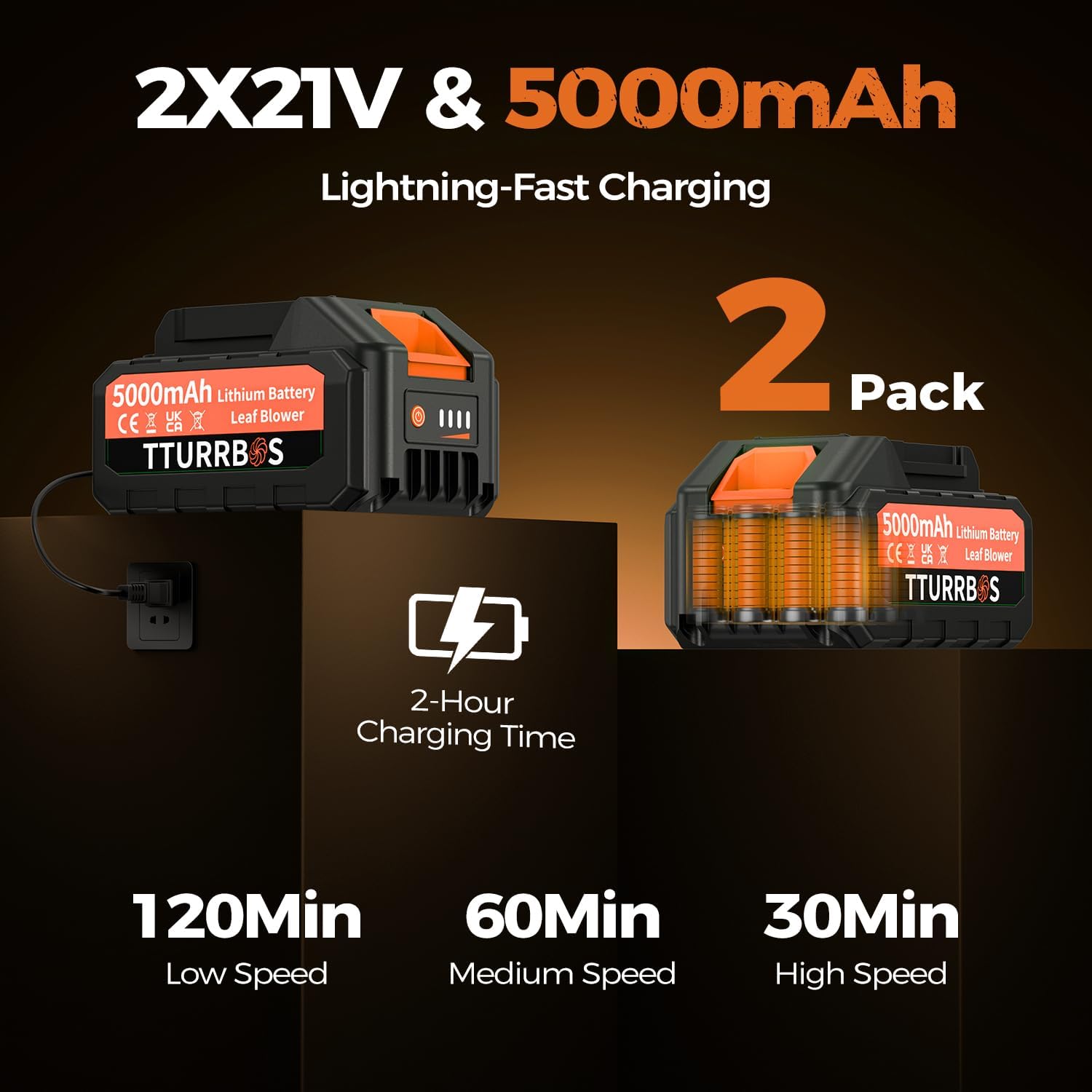 - ăLong-Lasting Power & Fast ChargingăOur cordless leaf blower with battery and charger delivers extended runtime and turbo performance. With dual 5.0Ah 21V lithium batteries, it runs for 120 minutes at low speed (30 minutes high speed) and features a 4-stage battery indicator (25%-50%-75%-100%) for real-time tracking. The advanced battery system ensures strong, steady airflow with no power loss, and the included fast charger fully powers your leaf blower in just 2 hours