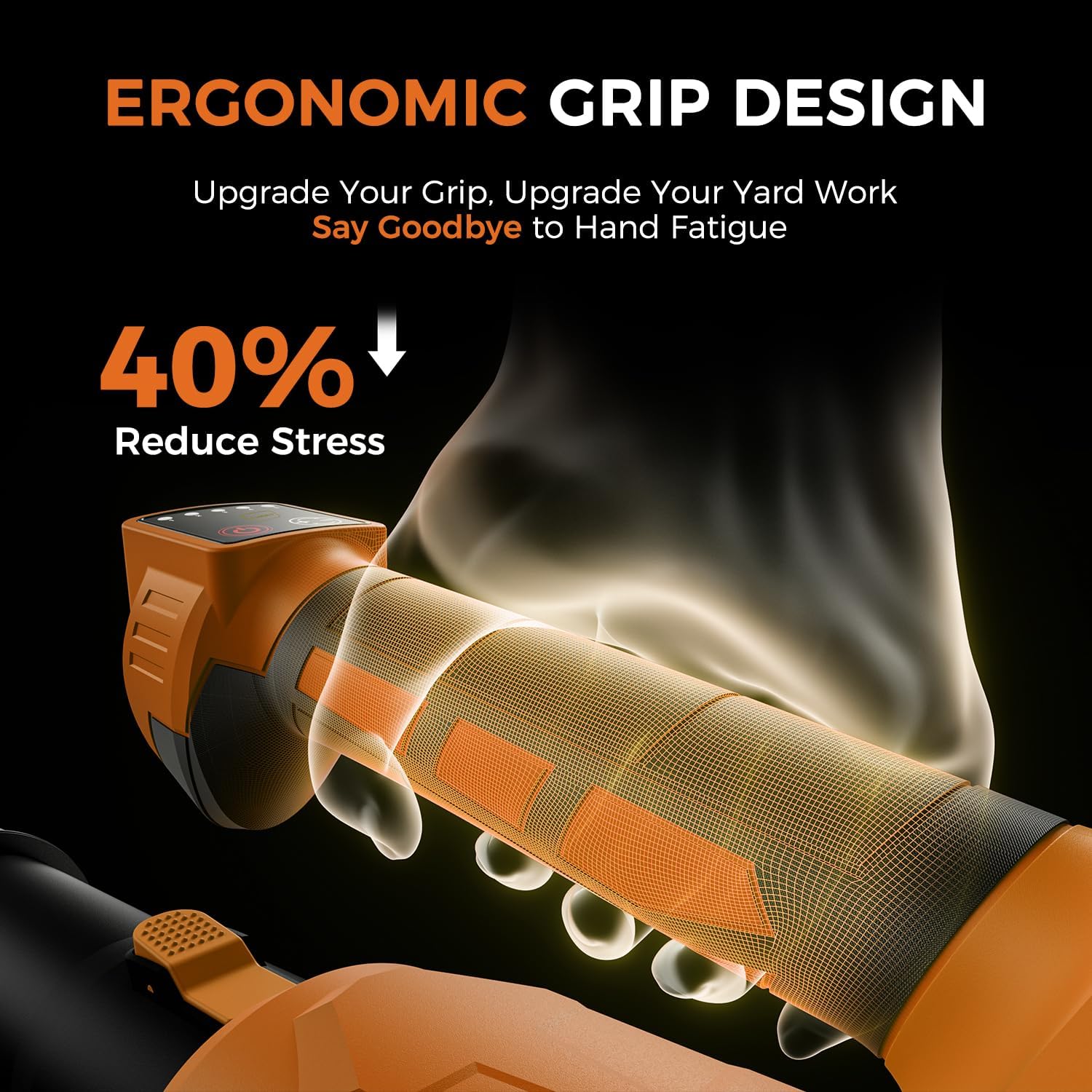 - ăErgonomic Grip DesignâSay Goodbye to Hand FatigueăTired of hand fatigue and discomfort while tackling yard work? Our cordless leaf blower is designed with a comfortable, ergonomic grip that reduces strain and vibration. The soft-touch grip provides steady control, even during prolonged useâsay goodbye to sore hands! Perfect for homeowners who demand both power and ease of use, these blowers for lawn care help you achieve a pristine yard without the aches