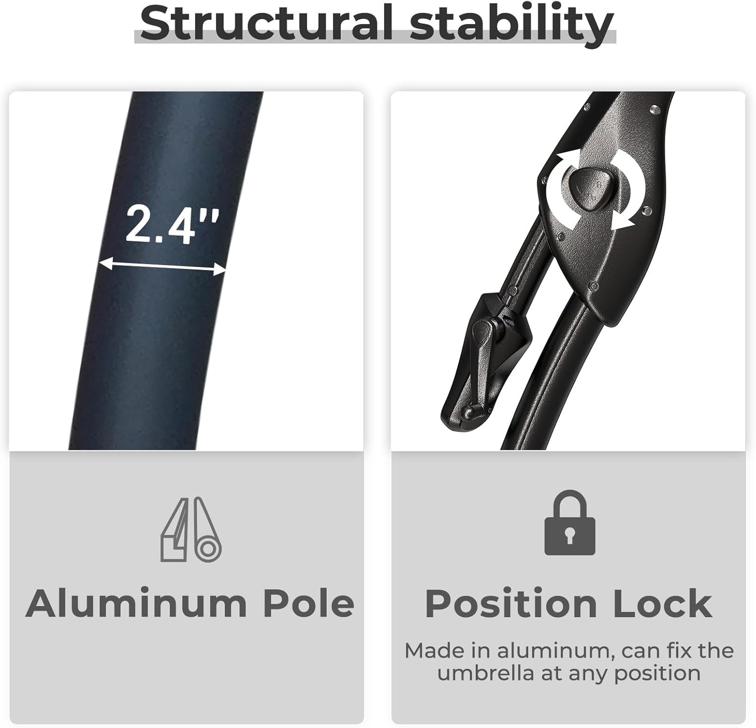 - Durable, Rust-Resistant Frame: Built with a 2.4" aluminum pole and 8 reinforced steel ribs. All metal parts are treated with anti-corrosion coating to handle outdoor weather with ease.