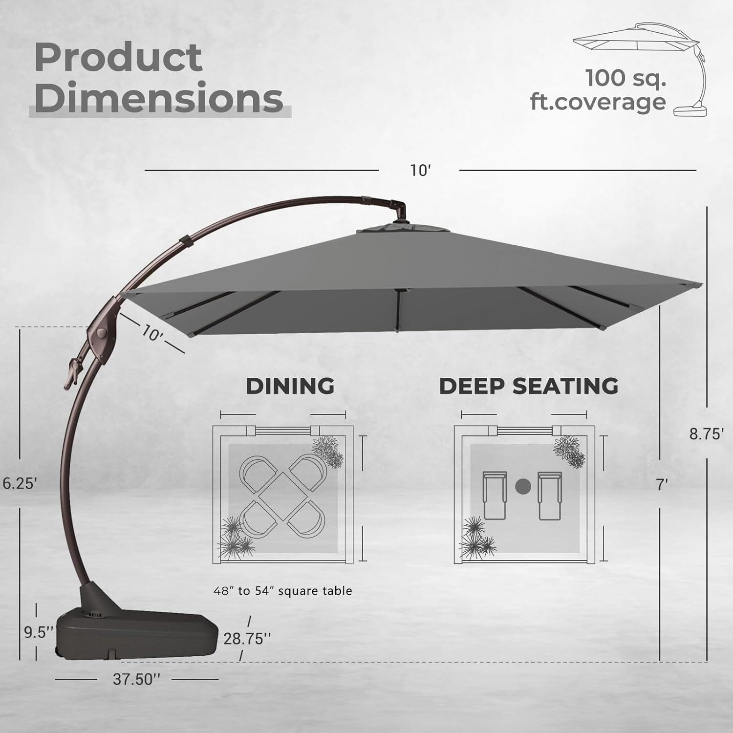 - Wide Cantilever Coverage: Provides up to 100 sq. ft. of cooling shade. The adjustable auto-lock tilt lets you easily follow the sun’s movement, keeping your space shaded all day long.