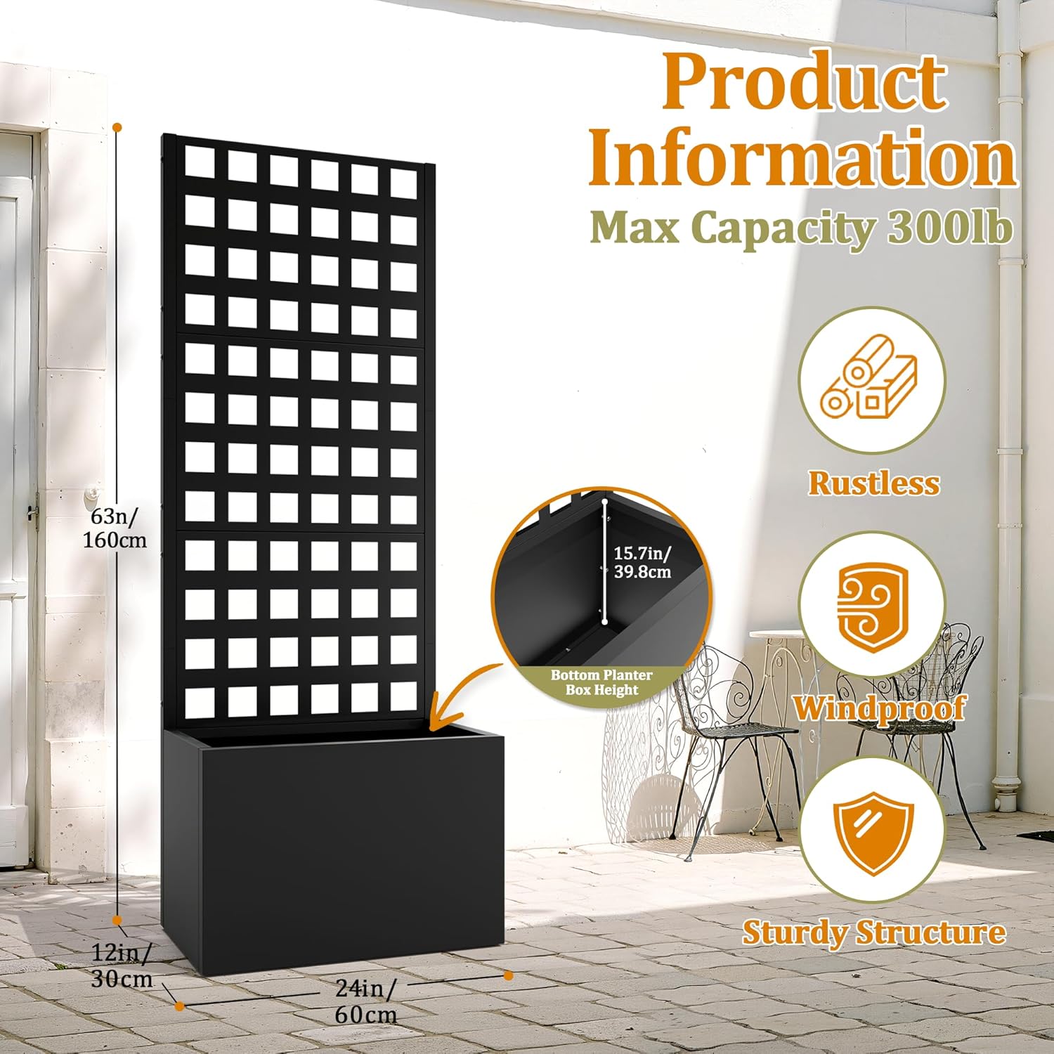 - 🛡️【Outdoor Privacy Screen & Metal Planter Box with Trellis】Use this metal planter box with trellis to create a natural divider on your patio, balcony, or yard. It’s more than just a garden raised bed for climbing plants—it’s also a beautiful metal planter with privacy screen that offers shade and separation. The sleek black frame and vertical lines of this metal planter box with trellis make it both decorative and practical.
