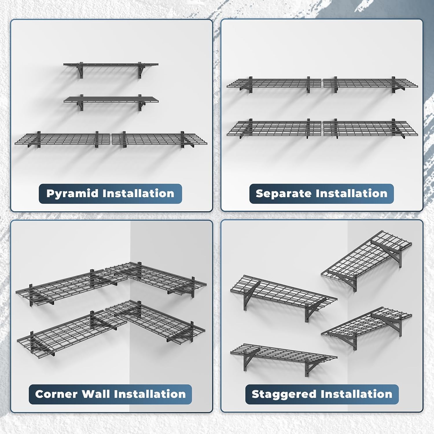- 📦【All-in-One Mesh Storage】- The seamless welded mesh design securely holds tires, sports gear, toolboxes, and plastic bins without sagging. Open-grid airflow prevents dust buildup, while the anti-rust coating ensures durability in humid garage environments.